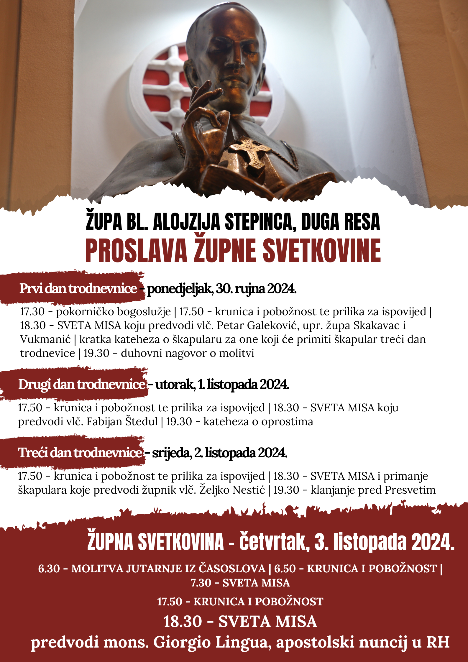 Župa bl. Alojzija Stepinca u Dugoj Resi proslavit će svoju župnu svetkovinu u četvrtak 3. listopada 2024. godine. Središnje misno slavlje u 18.30 u župnoj crkvi sv. Antuna Padovanskog predvodit će apostolski nuncij u Republici Hrvatskoj mons. Giorgio Lingua.