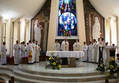 Potom su sudionici putovanja u katedrali sv. Bonaventure sudjelovali u euharistijskom slavlju koje je predvodio mons. Marko Semren, pomoćni biskup banjalučki. Biskup Semren je u svojoj propovijedi đakone potaknuo na bratsku ljubav utemeljenu na doživljaju i iskustvu Uskrslog Krista. Nakon euharistijskog slavlja đakoni su se susreli s mons. Franjom Komaricom, banjalučkim biskupom i predsjednikom BK BiH, s kojim su podijelili zajedništvo obiteljskog stola.