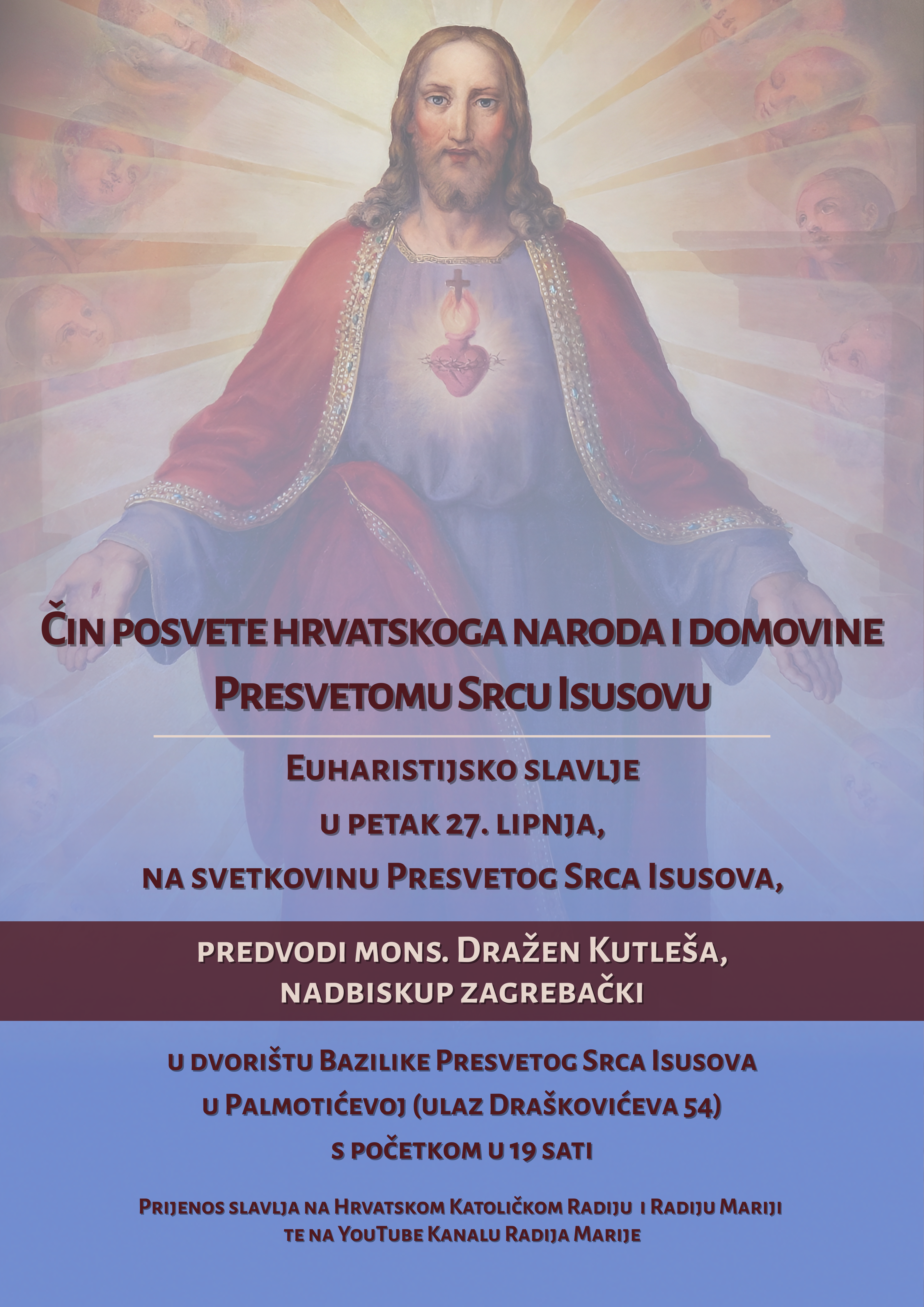 Misno slavlje započinje u 19 sati, a nakon Popričesne molitve uslijedit će Čin posvete hrvatskoga naroda i domovine Presvetomu Srcu Isusovu.