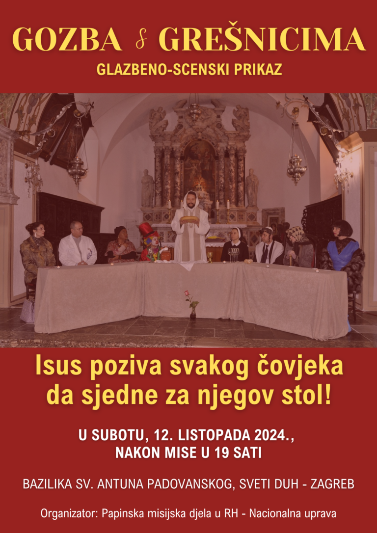 Papinska misijska djela u Republici Hrvatskoj, uz pomoć s. Vesne Lagetar i glumačke skupine iz Župe sv. Jelene Križarice u Kastvu, organiziraju glazbeno-scenski prikaz „Gozba s grešnicima“ koji će biti održan u subotu 12. listopada 2024. nakon mise u 19 sati u bazilici sv. Antuna Padovanskoga na Svetom Duhu u Zagrebu.
