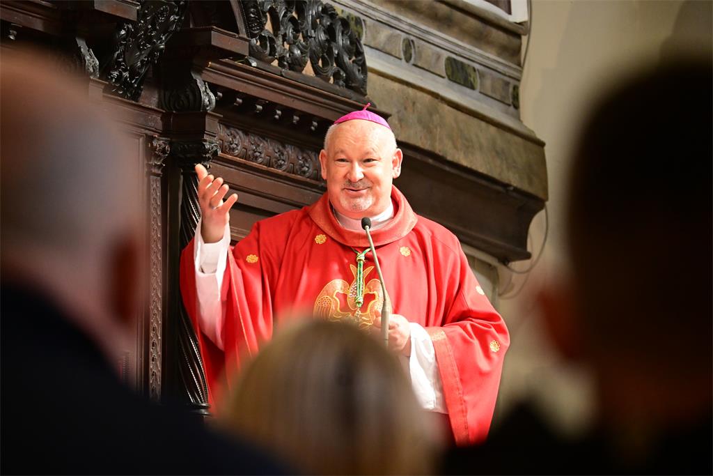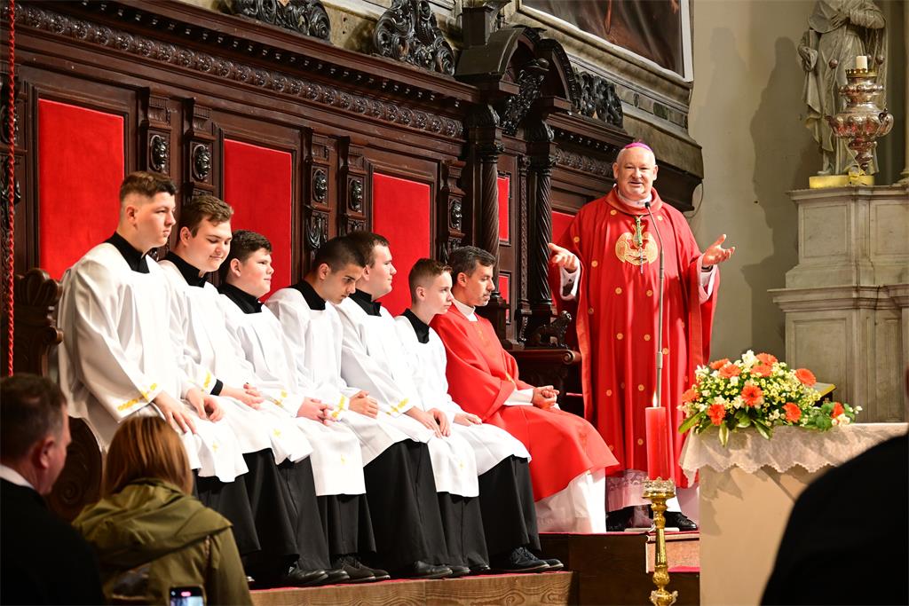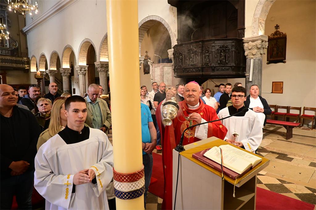 Poslije kratke okrjepe započelo je svečano misno slavlje u krčkoj prvostolnici koje je predvodio krčki biskup mons. Ivica Petanjak u koncelebraciji s rektorom preč. Matijom Pavlakovićem, duhovnikom sjemeništaraca vlč. Matkom Filipovićem i katedralnim župnikom don Vedranom Kirinčićem. Prigodnu homiliju izrekao je biskup Petanjak, a nakon svete mise okupljene je upoznao s bogatom poviješću grada Krka i same katedrale te je ukratko predstavio povjerenu mu biskupiju. Nakon zajedničke molitve na grobu sluge Božjega biskupa Antuna Mahnića, hodočasnici su imali prigodu i za kratku okrjepu u prostorima biskupskog ordinarijata.