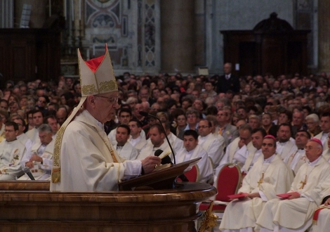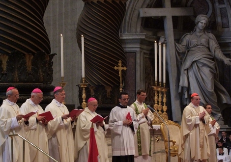 Pozdravivši u bazilici sv. Petra u Rimu sve okupljene hrvatske nadbiskupe i biskupe, generalnog tajnika Biskupske sinode u Rimu mons.Nikolu Eterovića, više od 260 svećenika iz svih hrvatskih nad/biskupija, dvjestotinjak bogoslova, đakone, redovnice i više od pet tisuća hodočasnika koji sudjeluju na Hrvatskome nacionalnom zahvalnom hodočašću, zagrebački nadbiskup kardinal Josip Bozanić, predvodio je danas u četvrtak 8. studenoga svečano misno slavlje na središnjem oltaru bazilike, iznad groba sv. Petra.