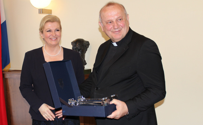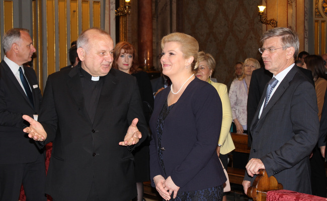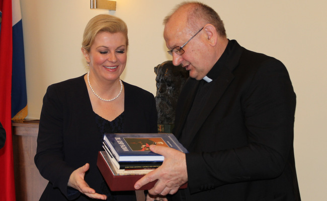 „Sa zanimanjem pratimo zbivanja u našoj domovini, proživljavamo i dijelimo s njom sve radosti i tjeskobe. Zanima nas o čemu raspravlja Hrvatski Sabor, zastupnici koji su dobili povjerenje od hrvatskih građana i kakovi se zakoni donose. Pratimo nastupe i istupe predsjednika Republike Hrvatske i drugih visokih dužnosnika i državnih predstavnika, kako u Domovini tako i po svijetu. Veseli nas kad u njima vidimo i prepoznajemo kompetentne osobe koje vole svoju Domovinu, koje promiču opće dobro svih hrvatskih građana, koje se zauzimaju za naš nacionalni identitet i prosperitet i bore se za opće dobro naše zajedničke kuće – naše zemaljske Domovine Hrvatske. Kao živi članovi Kristove Crkve molimo za svoje državne poglavare da mudro i razborito upravljaju” - napomenuo je rektor Bogdan te uručio Predsjednici nekoliko knjiga koje je Zavod u proteklo vrijeme objavio.