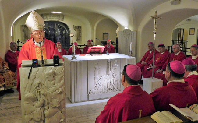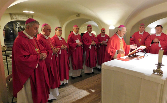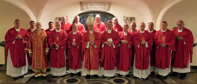 Hrvatski biskupi članovi Hrvatske biskupske konferencije slavili su misu u Bazilici sv. Petra na oltaru pokraj groba sv. Petra na početku svoga pohoda „Ad limina apostolorum“ u ponedjeljak 12. studenoga. Koncelebrirali su hrvatski rimski studenti iz Papinskog hrvatskog zavoda sv. Jeronima predvođeni rektorom vlč. Božom Radošem.