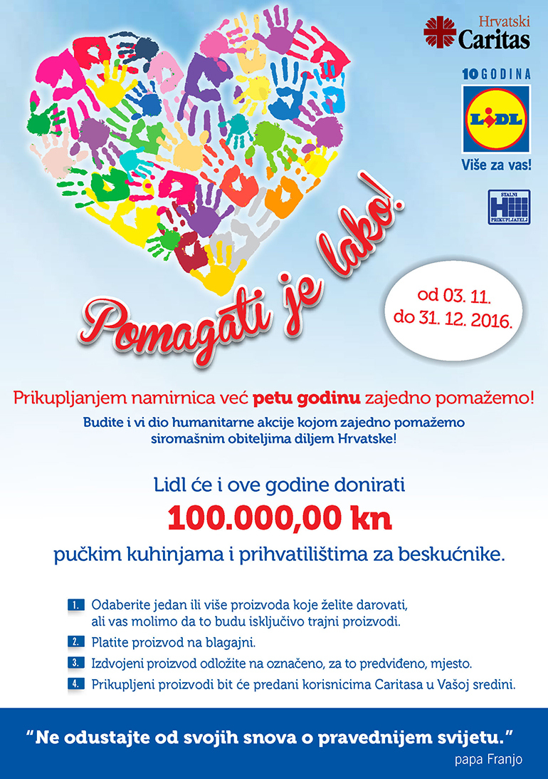Lidl Hrvatska zajedno s Hrvatskim Caritasom, nad/biskupijskim i župnim Caritasima u Hrvatskoj petu godinu zaredom organizira veliku nacionalnu humanitarnu akciju »Pomagati je lako!«. Prikupljanje namirnica trajat će od 3. studenoga do 31. prosinca 2016. u 89 Lidlovih trgovina u Hrvatskoj. Na području Zagrebačke nadbiskupije akcija se provodi u 22 Lidlove trgovine.