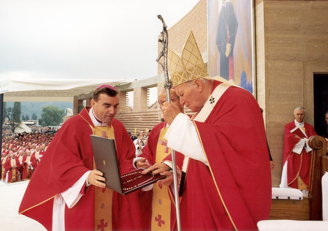 Slika: Nadbiskup zagrebački kardinal Josip Bozanić predaje dar blaženom papi Ivanu Pavlu II. za njegova pohoda Hrvatskoj, u Mariji Bistrici 3. listopada 1998. godine na misi beatifikacije kardinala Alojzija Stepinca