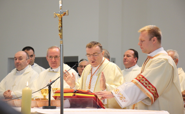 Pozdravnu riječ na početku euharistijskog slavlja uputio je domaći župnik vlč. Kristo Brkić, koji je izrazio radost što upravo danas, na 69. obljetnicu nepravedne presude protiv nadbiskupa Alojzija Stepinca, blaženikove moći pohranjujemo u oltar novoizgrađene crkve.