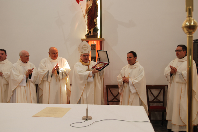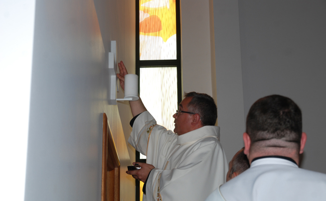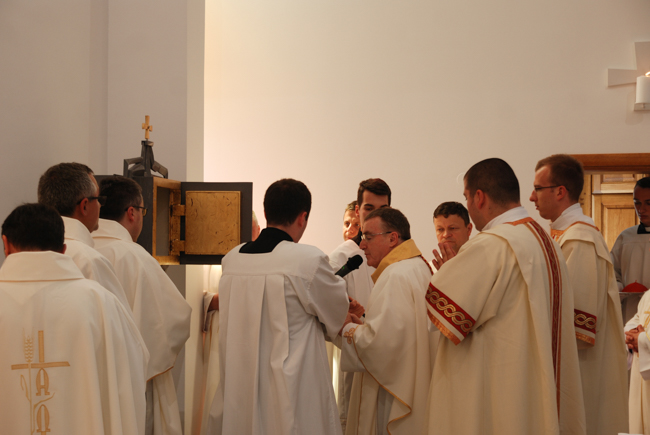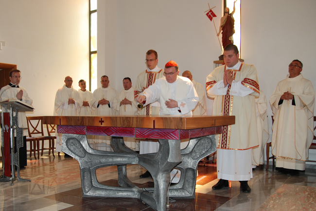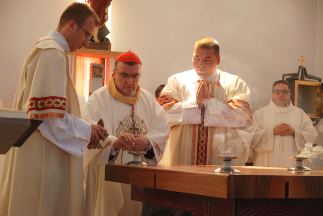 Nakon molitve Vjerovanja, p. Willi Klein, CPPS, unio je moći bl. Alojzija Stepinca koje je za ovu jedinstvenu prigodo donio Kardinal. „Ove svete relikvije stavljamo u ovaj oltar da i na taj način bl. Alojzije bude trajno prisutan među vama. Stoga kad god budete ulazili u crkvu spomenite se toga: ovdje je on koji za nas zagovara. On je moćan kod Boga. On nam pokazuje način na koji se mi moramo odnositi prema Bogu. Molite mu se često, tražite zagovor za sebe, za svoje obitelji, za djecu i mlade, i za sve koji se Bogu posvećuju“, rekao je Nadbiskup.