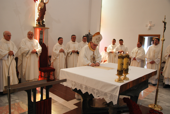 Uoči liturgije prinosa uslijedili su obredi posvete oltara, mazanje svetim uljem i paljenje tamjana na oltarnoj menzi, te pokrivanje novoposvećenog oltara novim oltarnikom koji su na oltar donijele redovnice Družbe sestara Klanjateljica Krvi Kristove i postavljanje oltarnih svijećnjaka. Zatim je uslijedila euharistijska služba koja je završila blagoslovom novog svetohraništa u koje je pohranjen Presveti oltarski sakrament. Ključeve svetohraništa uzoriti Kardinal predao je p. Iliji te potpisao bulu o posveti crkve koju je svečano pročitao vlč. Josip Kuzel, župnik župe Uzvišenja Svetog Križa.