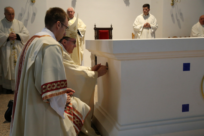 Po molitvi Vjerovanja kardinal Bozanić je vjernicima progovorio o bl. Alojziju Stepincu čije je moći potom položio u otvor oltara na kojem će se Bogu prinositi Presveta Žrtva. „Dragi vjernici, u oltar polažemo moći našeg Blaženika kako bi na taj način bio na poseban način bliz vama. U bl. Alojziju Stepincu Bog je Crkvi dao velikog sveca i zagovornika na nebu. Molite se i utječite se u svim prilikama života njemu.“