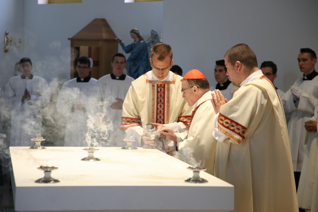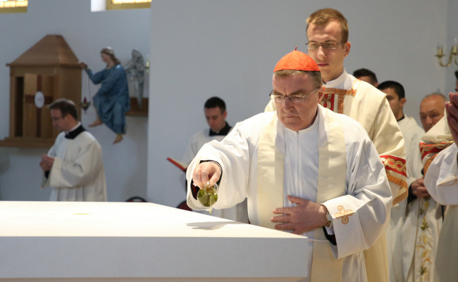 Uslijedilo je pomazanje oltara uljem krizme kojeg je učinio Kardinal, a na četiri mjesta na zidovima crkve znak križa uljem krizme načinio je župnik Šestak. Potom je uslijedilo kađenje oltara te priprema za prinos darova i euharistijsku službu uz paljenje svijeća i svjetala u crkvi. Svaki čin u tim svečanim obredima Kardinal je okupljenim vjernicima protumačio, njihov značaj u liturgiji te stvarnosti na koje upućuju u životu župne zajednice i svakog njezinog člana.