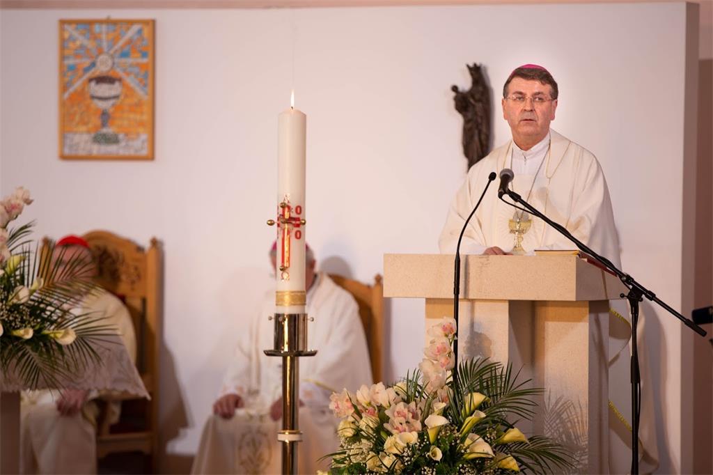 U završnome dijelu homilije podsjetio je kako je kršćanska molitva snažnija kad govori: „Gospodine, molim te, dopusti mi da vidim tvoju blizinu i u nevoljama, da budem zadivljen otajstvom života… I onda kada se čini da je prevladala smrt.“. Napomenuo je, stoga, da je potrebno češće kleknuti, pogledati nebo, zaviriti u one, možda davno napuštene, kutke vlastita bića kako bi se usredotočilo na život, ljubav i smrt kao jedine stvarnosti koje se čovjeka uistinu tiču. - Otajstvo života koje seže onkraj smrti – to večeras slavimo i molimo Gospodina da nam učvrsti vjeru, da nam daruje divljenje; čak i ne toliko pred bezmjernim čudima, nego pred blizinom i ljubavlju čovjeka. – kazao je biskup Šaško te poručio: - Ove večeri, ove noći Bog nam daje život i mir da ga darujemo, da svjedočimo da je Isus uskrsnuo od mrtvih. To je jedina istinska nada koju možemo reći; jedini navještaj sposoban poraziti sile zla i promijeniti povijest ranjenoga čovječanstva, uvijek u dubini željnoga života; života koji svakoga dana živimo podno ovoga uskrsnog plamena, prisutnoga u crkvama i u vašim domovima. Čuvajmo njegovo svjetlo i toplinu. –