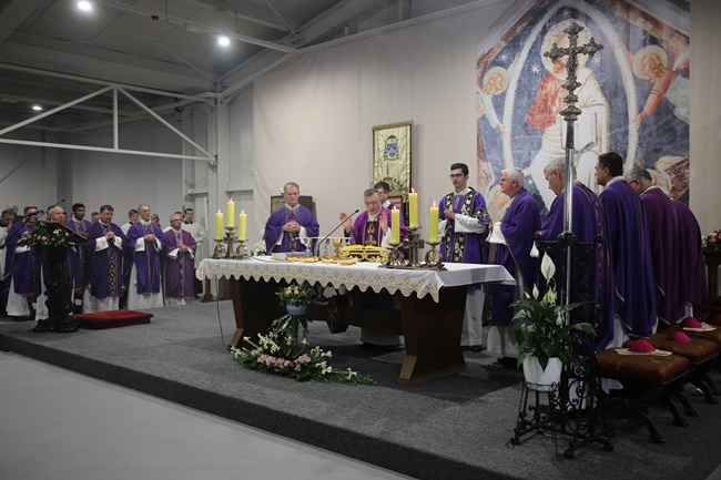Na početku misnoga slavlja kardinal Bozanić kazao je kako "u godini u kojoj je pomoćni biskup zagrebački mons. Valentin Pozaić zahvaljivao Bogu za pedeset godina svećeništva, sabrali smo se u ovom Bogoslužnom prostoru blaženoga Alojzija Stepinca da, nakon sprovoda na Mirogoju, euharistijom zahvalimo Bogu za život i službu biskupa Valentina i da se po Duhu Svetomu povežemo s njime u vječnoj hvali Kristu, Prvosvećeniku, koji je uzašao na nebo, sjedi s desne Ocu i koji će opet doći u slavi suditi žive i mrtve."