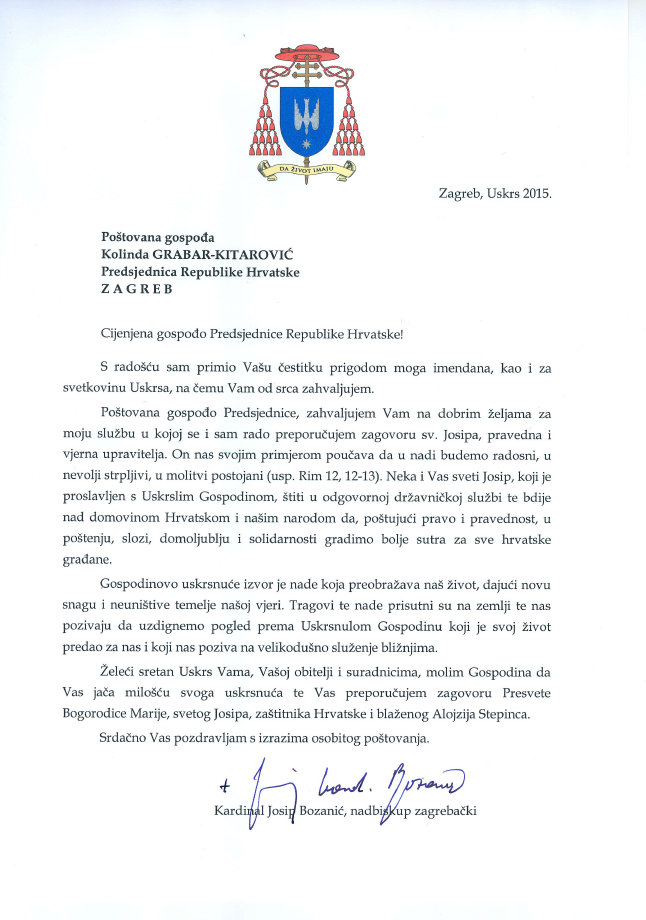 Zagrebački nadbiskup kardinal Josip Bozanić uputio je zahvalu predsjednici Republike Hrvatske gospođi Kolindi Grabar - Kitarović za čestitke prigodom imendana i uskrsnih blagdana: