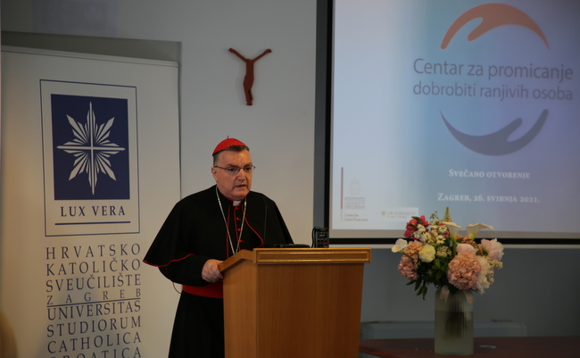 1. Drago mi je što smo danas blagoslovili i otvorili Centar Hrvatskoga katoličkog sveučilišta za promicanje dobrobiti ranjivih osoba. Čestitam veleučenom rektoru dr. Željku Tanjiću, prof. dr. Josipu Bošnjakoviću, supervizoru rada Centra, gospođi mr. Marini Šijaković, voditeljici Centra, svima koji su nam dali podršku, posebno prof. P. Hansu Zollneru, dobrotvornim ustanovama koje su pomogle ostvarenje Centra i svekolikoj sveučilišnoj zajednici.
