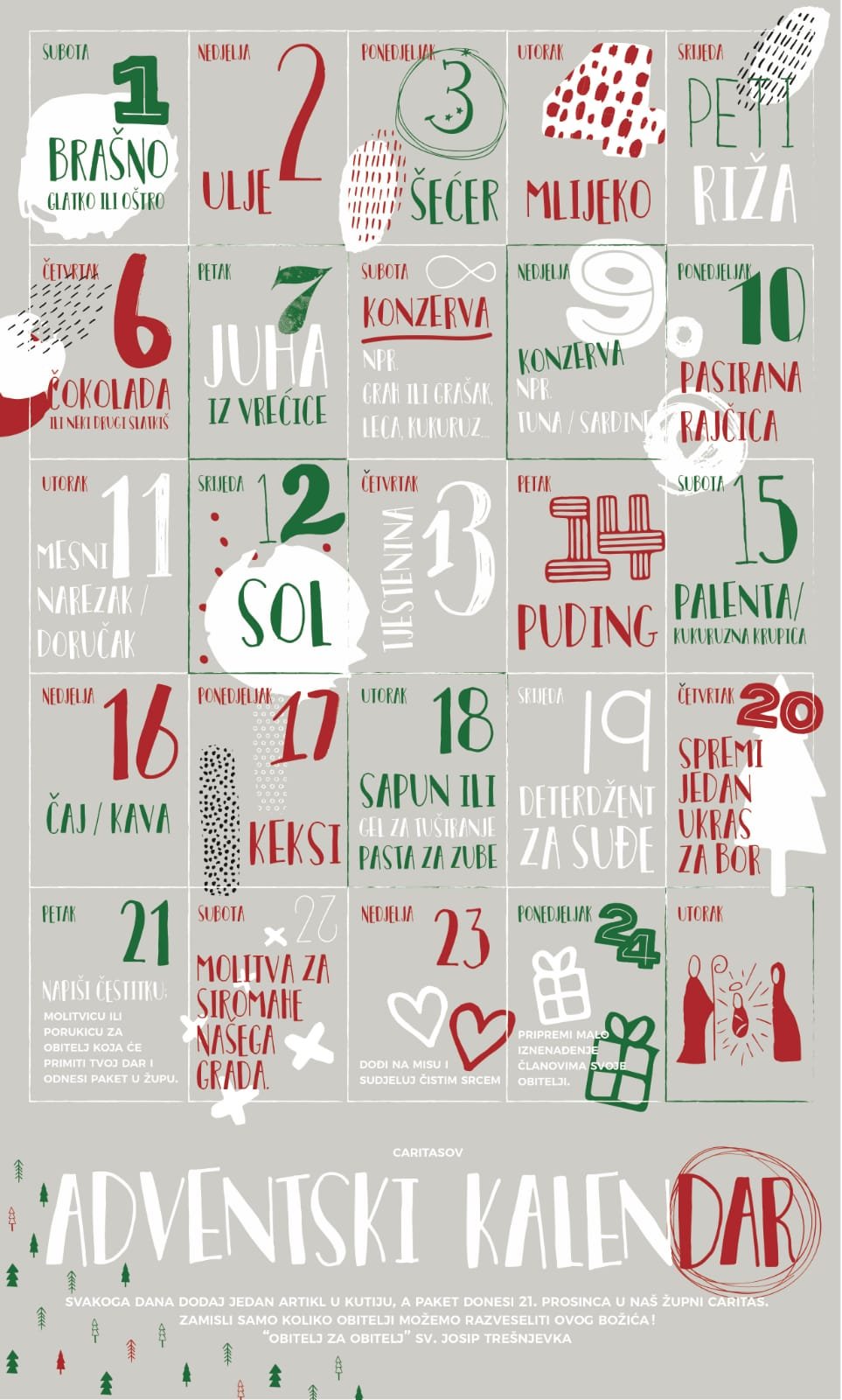 Caritasov adventski kalenDAR u kojem svaki dan predstavlja jednu konkretnu namirnicu. Primjerice: 1.prosinca skupljalo se ulje, 2.prosinca brašno, 3. prosinca šećer i tako dan po dan i eto nam božićnog paketa. Radosni smo što je ovaj Caritasov adventski kalenDAR prepoznat i izvan granica naše župe što smo se uvjerili kako u velikom broju donesenih paketa tako i u povratnim dojmovima darivatelja.