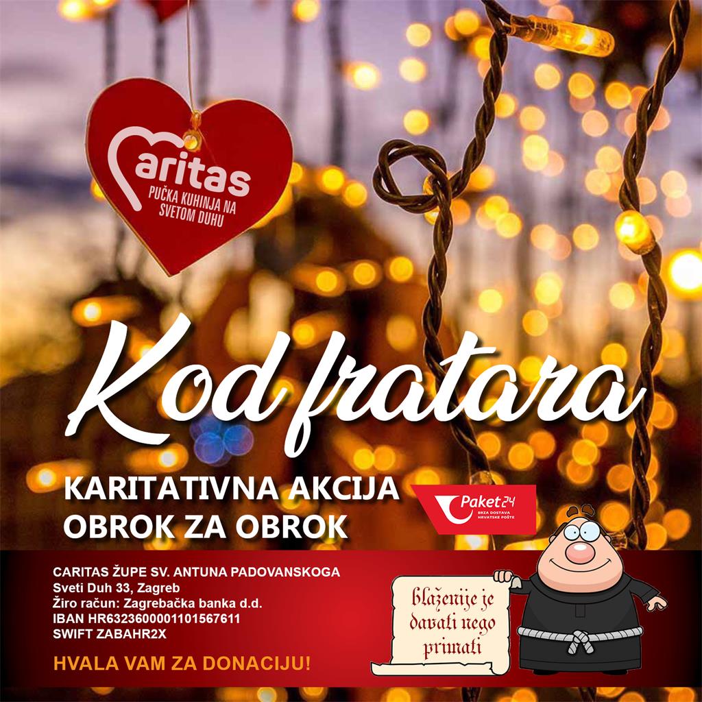 Karitativna akcija Obrok za obrok kod fratara kojom se podupire rad Pučke kuhinje na Svetom Duhu i ove će se godine održati tijekom adventa. Njihovo priopćenje pročitajte u nastavku.