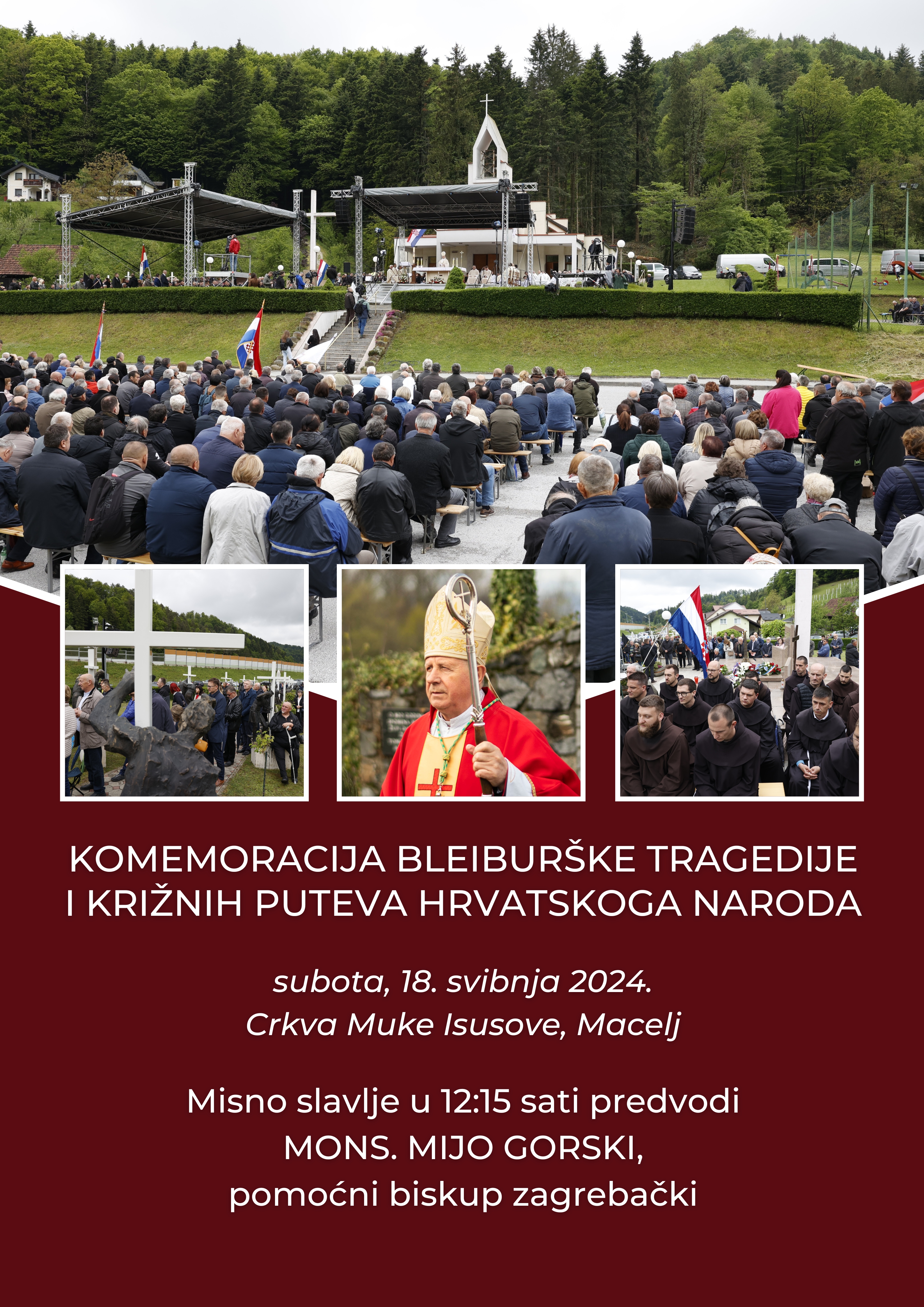 U subotu 18. svibnja 2024. godine mons. Mijo Gorski, pomoćni biskup zagrebački, predvodit će euharistijsko slavlje u Crkvi Muke Isusove u Maclju, prigodom komemoracije Bleiburške tragedije i križnih puteva hrvatskoga naroda, s početkom u 12.15 sati.