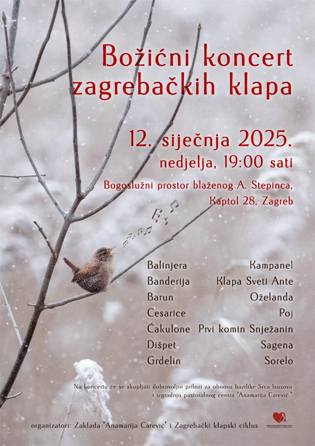 Zaklada Anamarija Carević u sklopu Zagrebačkog klapskog ciklusa organizira božićni koncert zagrebačkih klapa u nedjelju Krštenja Gospodinova, 12. siječnja u 19 sati u Bogoslužnom prostoru blaženog Alojzija Stepinca (Kaptol 28).