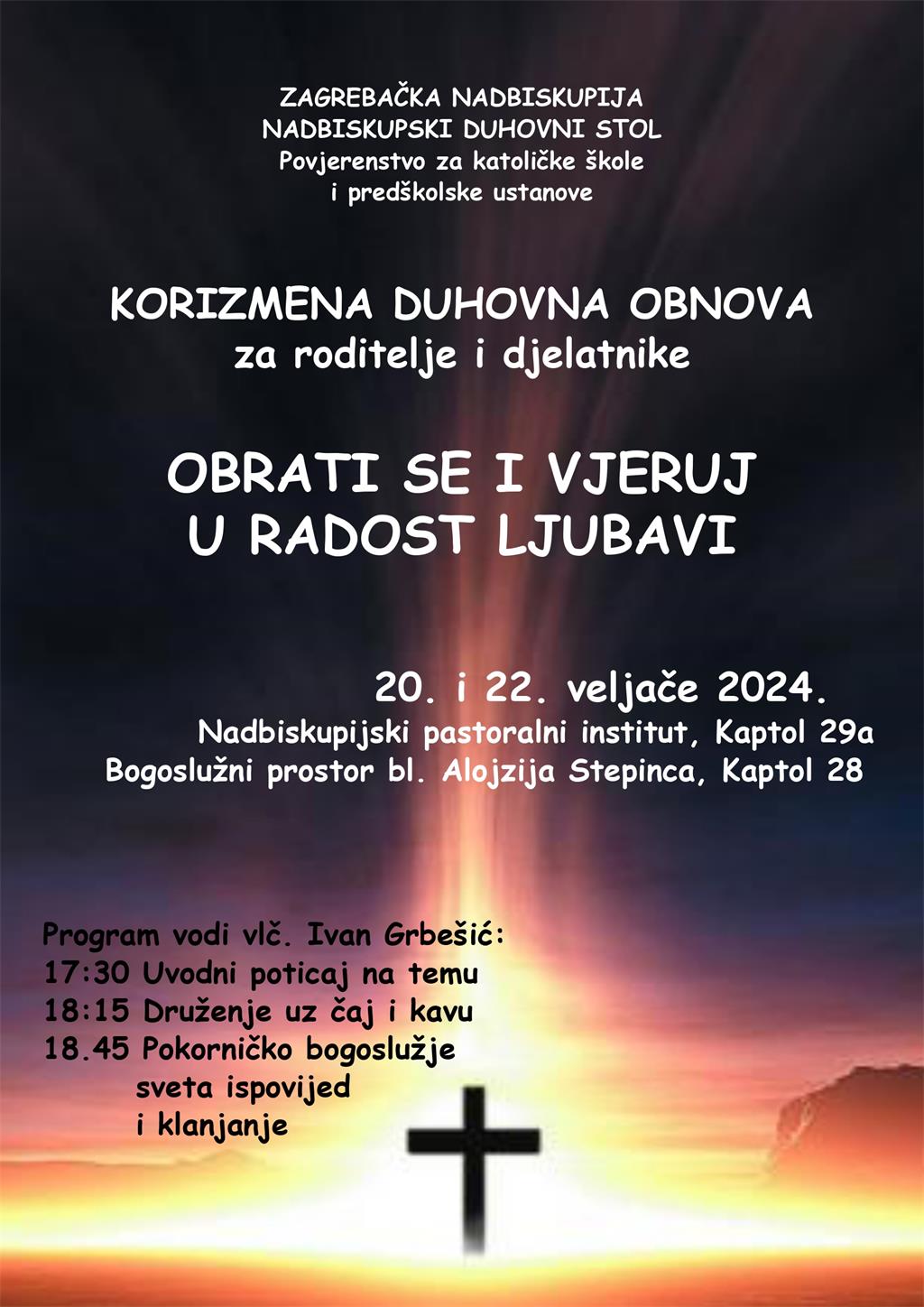 Korizmena duhovna obnova za roditelje i djelatnike katoličkih škola i predškolskih ustanova s temom "Obrati se i vjeruj u radost ljubavi" održat će se 20. i 22. veljače u Nadbiskupijskom pastoralnom institutu i Bogoslužnom prostoru bl. Alojzija Stepinca.
