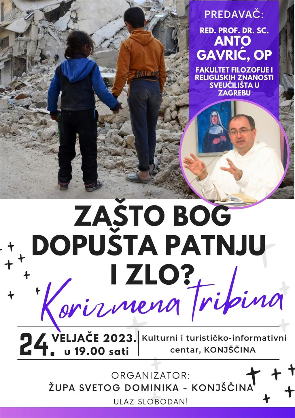 Župa svetog Dominika u Konjščina poziva na Korizmenu tribinu na temu "Zašto Bog dopušta patnju i zlo?". Predavač je red. prof. dr. sc. Anto Gavrić, OP, profesor na Fakultetu filozofije i religijskih znanosti Sveučilišta u Zagrebu.