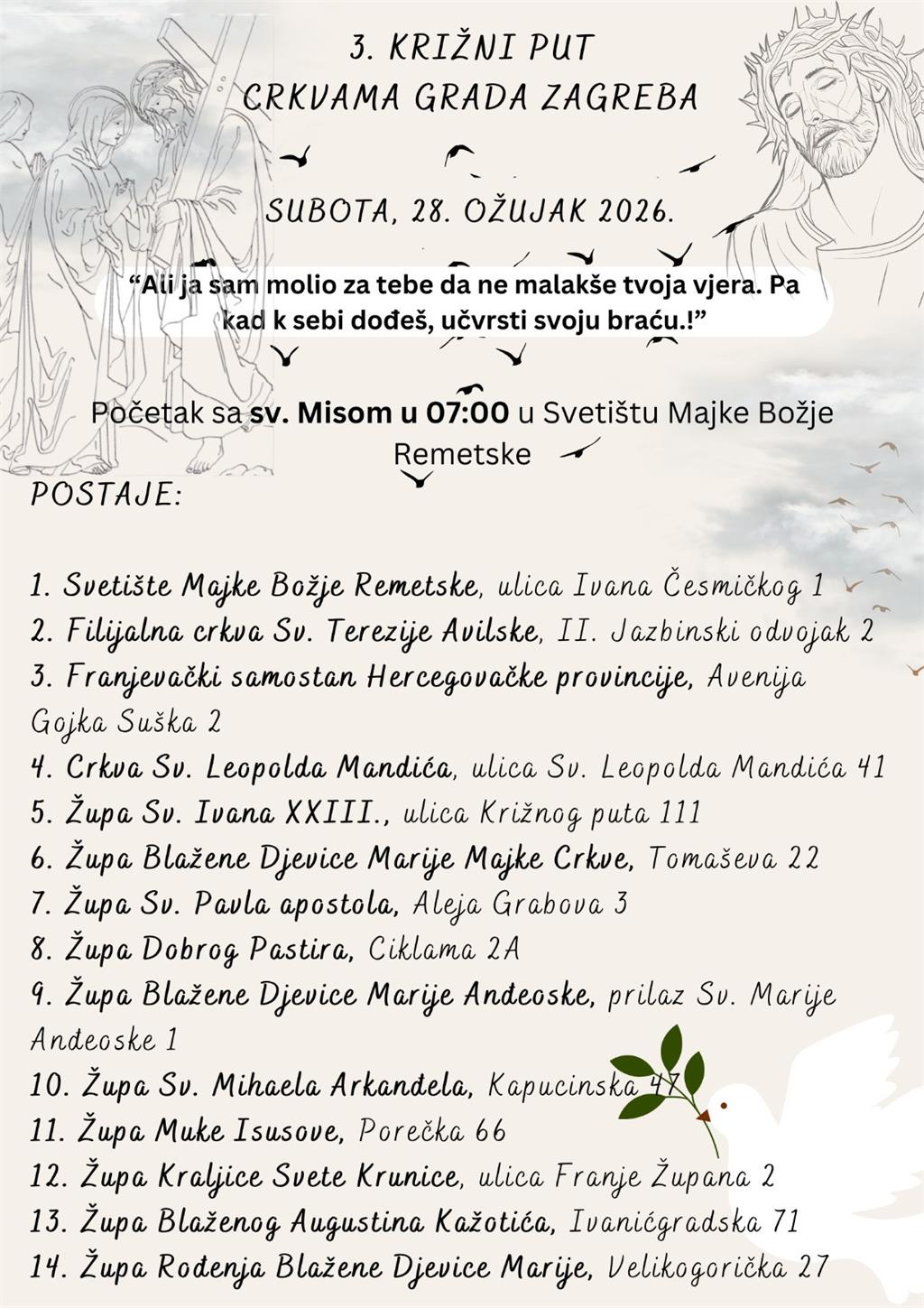 Križni put crkvama grada Zagreba održat će se u subotu 28. ožujka. Misno slavlje bit će u 7 sati u Svetištu Majke Božje Remetske.