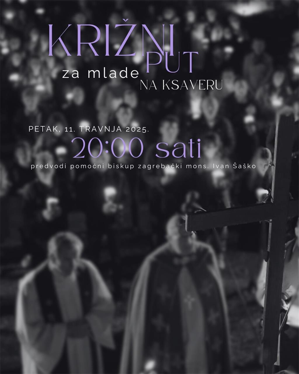 Ured za pastoral mladih Zagrebačke nadbiskupije u petak prije Nedjelje Muke Gospodnje, 11. travnja, s početkom u 20 sati organizira Križni put sa svijećama za mlade na ksaverskoj Kalvariji. Križni put predvodit će pomoćni biskup zagrebački mons. Ivan Šaško.