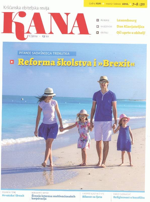 U uvodniku ljetnoga dvobroja obiteljske revije Kana Josip Grbac promišlja o "Reformi škole i '"Brexitu'". Tako u prvom dijelu teksta daje osvrt na "planirane" reforme, tj. rad radne skupine za izradu novog modela školstva u Hrvatskoj. "Sumnjam da se politika koja je radnu skupinu stvorila, vodila samo kriterijima stručnosti, neovisnosti, objektivnosti. No, kada bi tako i bilo, koji će to istinski član radne skupine za izradu novog modela školstva u Hrvatskoj odbiti sugestije i doprinose koje mogu dati vrhunski hrvatski znanstvenici?" Povezujući tu temu s izlaskom Velike Britanije iz EU, autor ističe, da "bilo kakva politika koja ne osluškuje osjećanja, shvaćanja, strahove vlastitog naroda, koja ne drži do vrijednosti koje su jednom narodu prioritetne, takva politika prije ili poslije doživljava poraz".