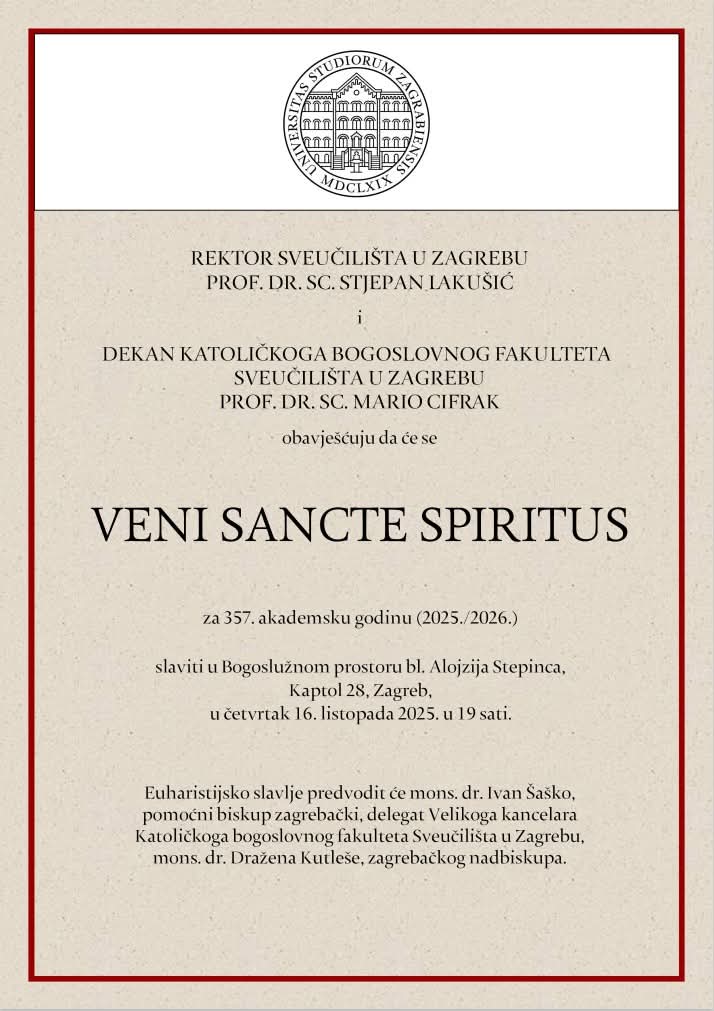 Veni Sancte Spiritus - misa sa zazivom Duha Svetoga za 357. akademsku godinu (2025./2026.) na Sveučilištu u Zagrebu slavit će se u Bogoslužnom prostoru bl. Alojzija Stepinca u Zagrebu (Kaptol 28) u četvrtak 16. listopada u 19 sati.