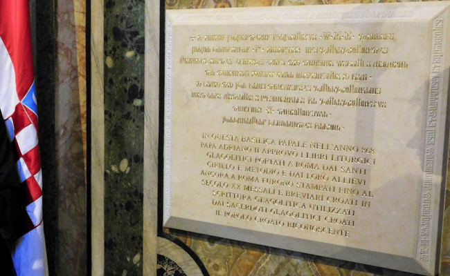 U ovoj papinskoj bazilici 868. godine papa Hadrijan II. odobrio je glagoljske liturgijske knjige koje su sveti Ćiril i Metod sa svojim učenicima donijeli u Rim. U Rimu su za naše svećenike glagoljaše tiskani misali i brevijari na glagoljici sve do XX. stoljeća. Zahvalan hrvatski narod.“