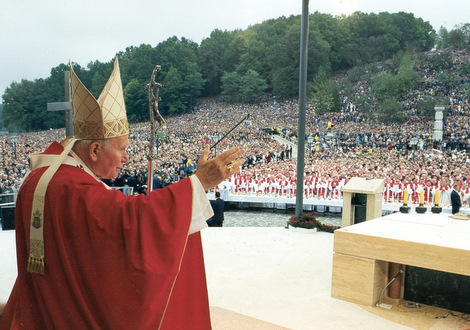 Slika: Blaženi papa Ivan Pavao II. pozdravlja i blagoslivlja hrvatski narod u svetištu Majke Božje Bistričke na misi beatifikacije kardinala Alojzija Stepinca, 3. listopada 1998. godine