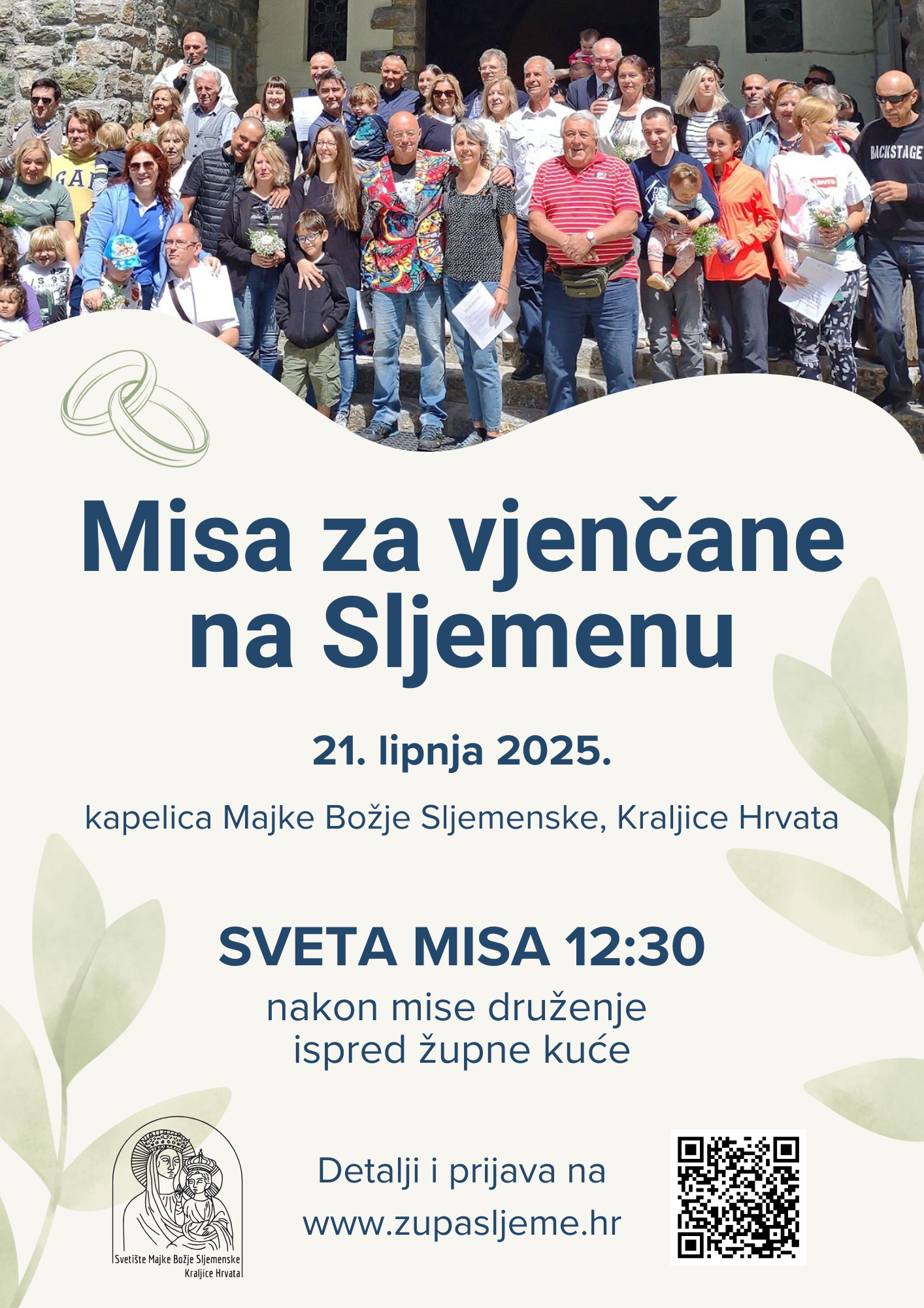 Župa Majke Božje Sljemenske Kraljice Hrvata poziva sve bračne parove koji su se vjenčali u kapelici Majke Božje Sljemenske Kraljice Hrvata na susret zahvalnosti i zajedništva.