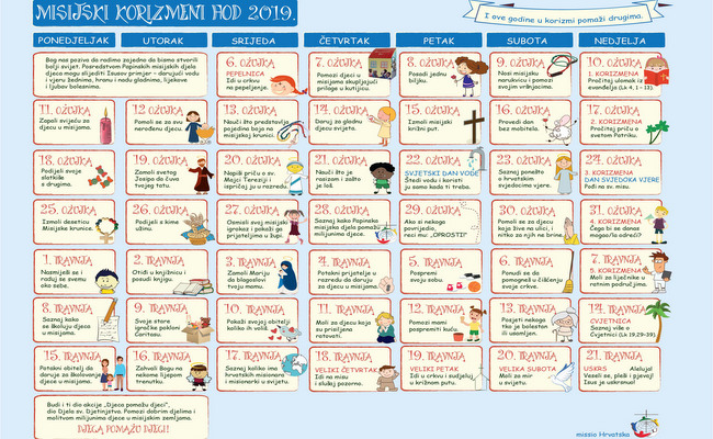 U sklopu projekta 'Djeca pomažu djeci' Papinska misijska djela Hrvatske pripremila je 'Misijski korizmeni hod'. Od Pepelnice do Uskrsa svakodnevnim poticajima djecu se poziva da prate korake i budu dio akcije 'Djeca pomažu djeci', te tako postanu dio Djela sv. Djetinjstva koji molitvom i dobrim djelima pomažu više od 20 milijuna djece u misijskim zemljama.
