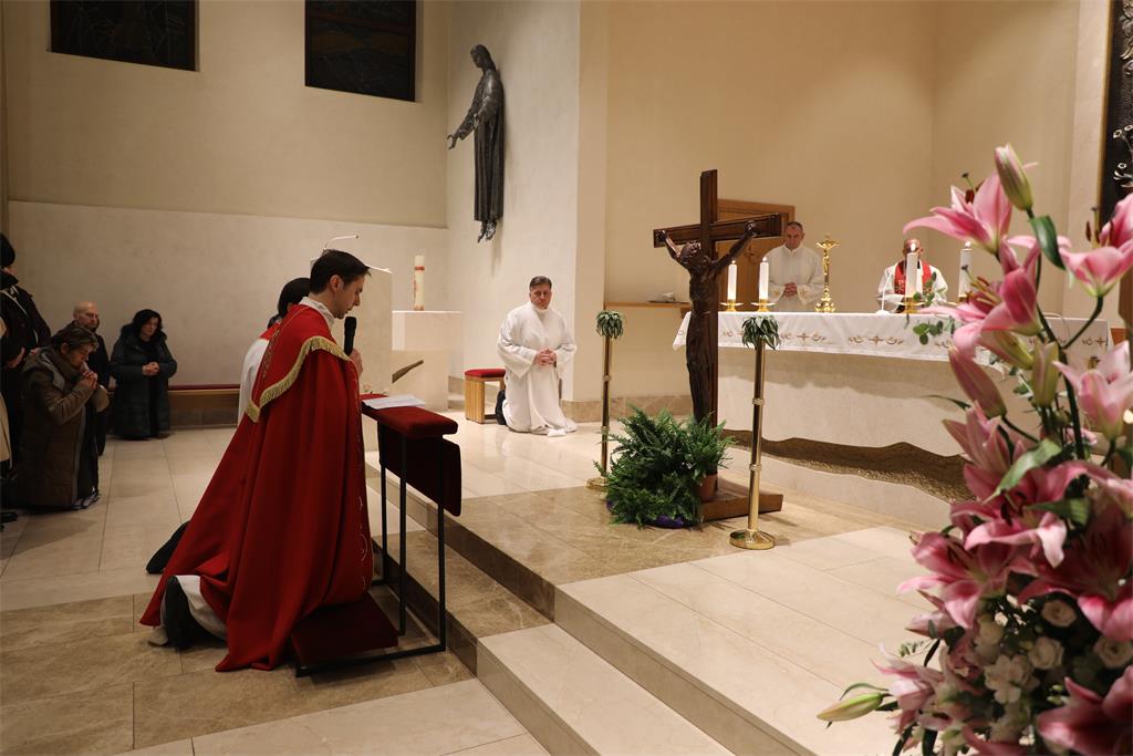 U procesiji je svečano unesen križ ispred kojega je mons. Kovač klečeći izmolio molitvu predanja položivši ispred križa ruže, simbol Blažene Djevice Marije te ljiljane s lijeve i desne strane križa, simbol svetoga Josipa koji se nalazi u biskupskom grbu imenovanog biskupa.