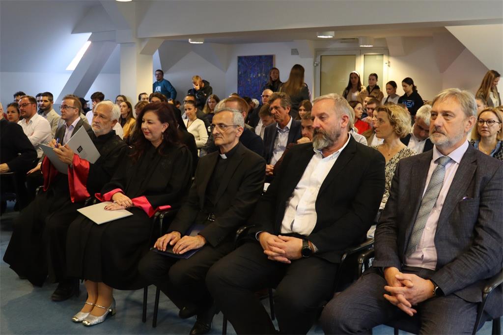 Proslava je nastavljena u dvorani "Bl. Alojzije kard. Stepinac", a prisustvovali su državna tajnica Ministarstva pravosuđa, uprave i digitalne transformacije Vedrana Šimundža Nikolić; posebni savjetnik Ministrice kulture i medija dr. sc. Ivica Poljičak; ravnateljica Agencije za odgoj i obrazovanje mr. sc. Katarina Milković; predstavnici Katoličkoga bogoslovnog fakulteta Sveučilišta u Zagrebu predstojnik Instituta religijskih znanosti izv. prof. dr. sc. Denis Barić, pročelnik Katedre za dogmatsku teologiju prof. dr. sc. Fra Ivan Karlić, izv. prof. dr. sc. Martina s. Ana Begić; s Fakulteta elektrotehnike i računarstva Sveučilišta u Zagrebu izv. prof. dr. sc. Mihaela Vranić; izvršna direktorica CroAI - Hrvatske udruge za umjetnu inteligenciju Lorena Barić; predsjednik udruge Pragma Nedjeljko Marković; župnik i upravitelj župe i rektor bazilike na Svetom Duhu fra Ivan Marija Lotar, OFMConv.; voditelj Pučke kuhinje na Svetom Duhu fra Vilček Novački, OFMConv.; pročelnici Sveučilišnih odjela, dekani i prodekani fakulteta Hrvatskog katoličkog sveučilišta; profesori i vanjski suradnici Sveučilišnog odjela za sociologiju te studenti, alumniji, prijatelji Odjela i suradnici s drugih znanstvenih institucija.
