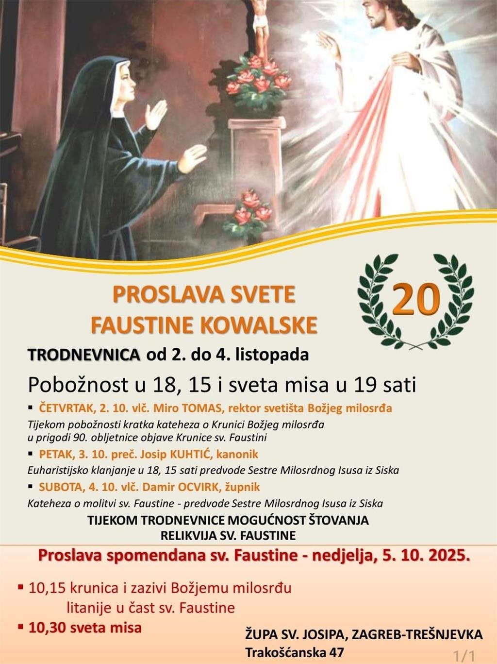 Župa sv. Josipa na zagrebačkoj Trešnjevki obilježit će spomendan sv. Faustine Kowalske trodnevnicom od 2. do 4. listopada te središnjom proslavom u nedjelju 5. listopada. Pobožnost Božjem milosrđu molit će se sva tri dana u 18.15, a svete mise slavit će se u 19 sati.