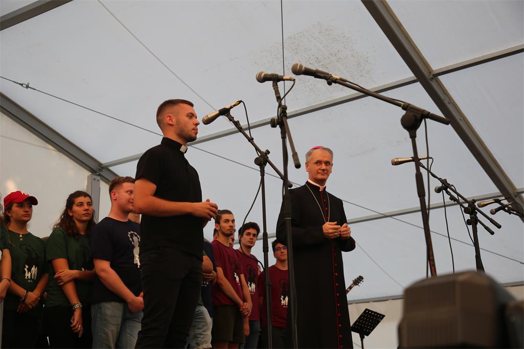 Pozdrav u ime mladih uputio je Domagoj Škvorčević. „Danas smo krenuli Marijinim putem i pohitali u gorje. Iako umorni, radosna srca došli smo u njeno svetište. Posebno nam je drago što ste ove godine i vi po prvi puta s nama. U ovom našem zajedništvu prepoznajemo Božju dobrotu, kao i brojne generacije naše Nadbiskupije koje već 21 godinu hodočaste Majci Božjoj Bistričkoj. Želimo vam da u svojoj pastirskoj službi u našoj Nadbiskupiji slijedite primjer blaženog Alojzija Stepinca, a na tom putu molit ćemo za vas zagovor Nebeske Majke. U svojim molitvama sjetite se nas mladih Zagrebačke nadbiskupije. Veselimo se budućim zajedničkim susretima!“