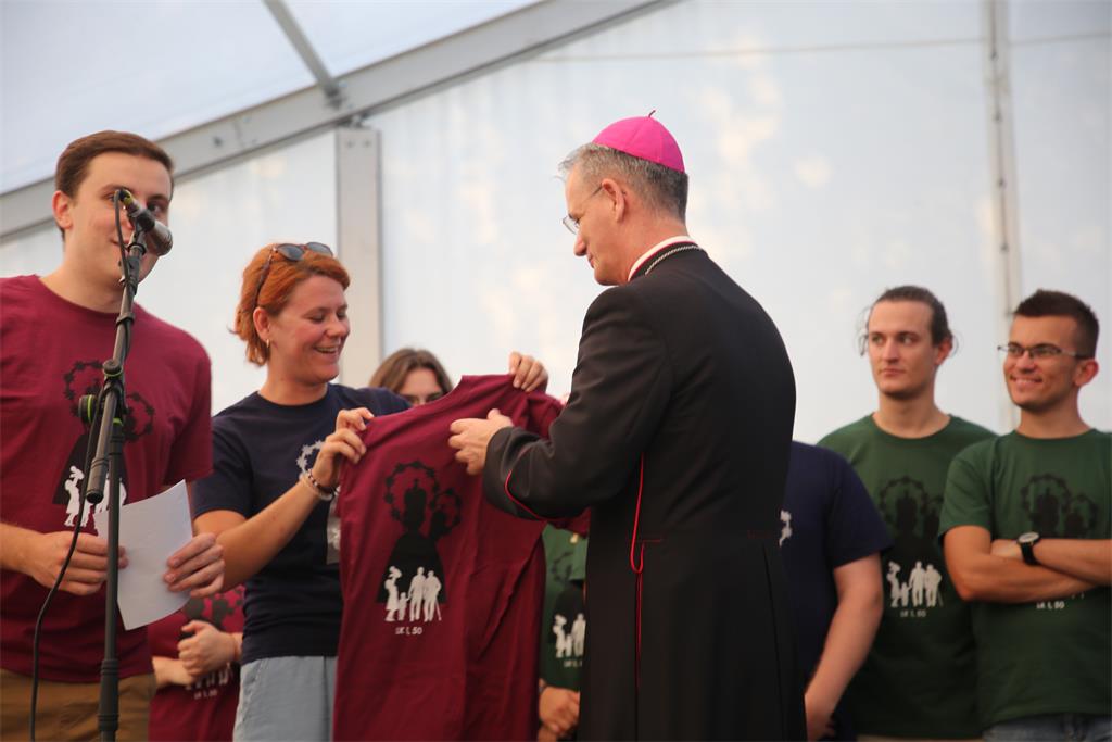 Mladi su Nadbiskupu poklonili licitarsko srce, jedan od simbola Marije Bistrice, te hodočasničku majicu s geslom hodočašća mladih „Od koljena do koljena dobrota je njegova“ (Lk 1, 50).