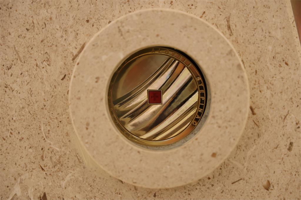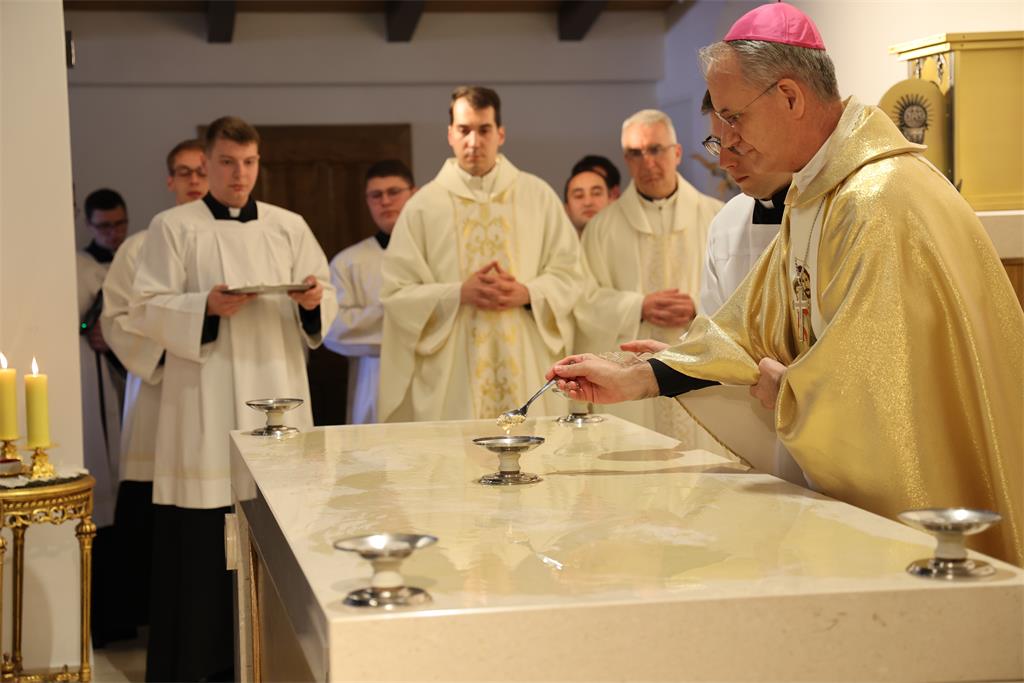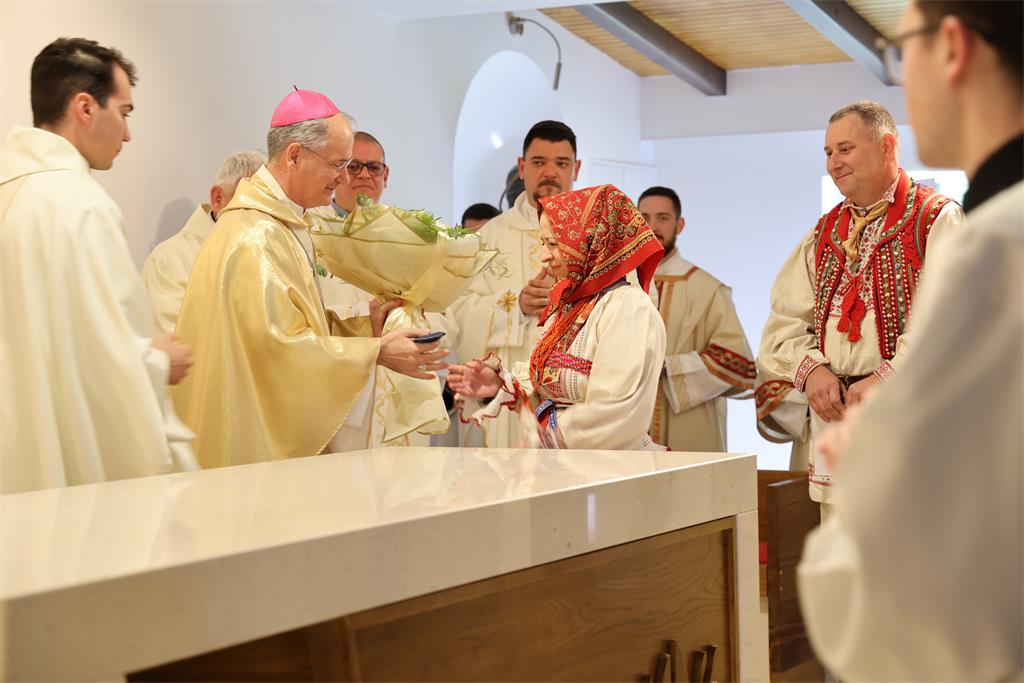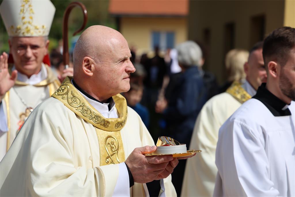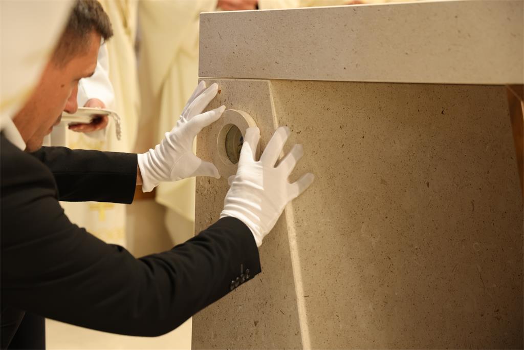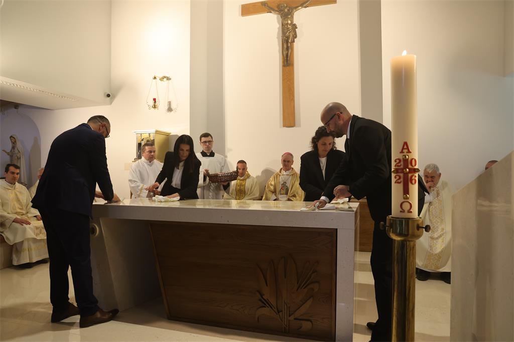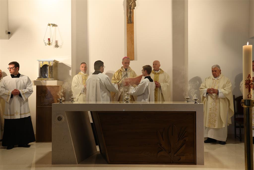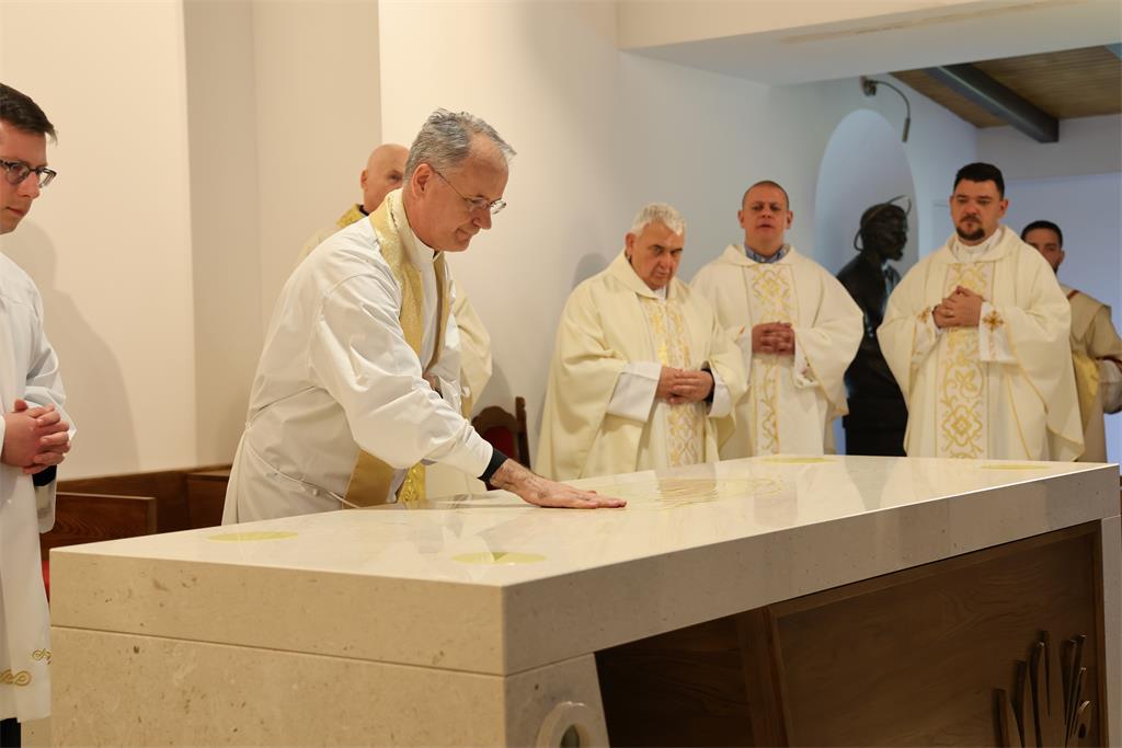 Nakon homilije i ispovijesti vjere okupljena zajednica zapjevala je Litanije svih svetih, a zatim je nadbiskup Kutleša u oltar položio moći bl. Alojzija Stepinca. Uslijedila je posvetna molitva, nakon koje je Nadbiskup izlio krizmu i pomazao oltar, a dekan preč. Ljubomir Vuković i župnik vlč. Branimir Budinski pomazali su posvetne križeve na stupovima u crkvi.