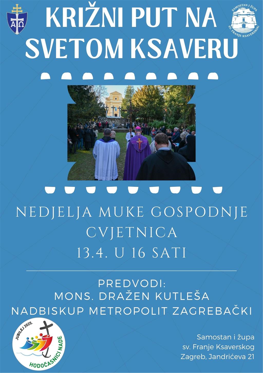 Na Nedjelju Muke Gospodnje - Cvjetnicu, 13. travnja 2025. godine, zagrebački nadbiskup mons. Dražen Kutleša predvodit će pobožnost križnoga puta na Ksaveru. Pobožnost počinje u 16 sati.