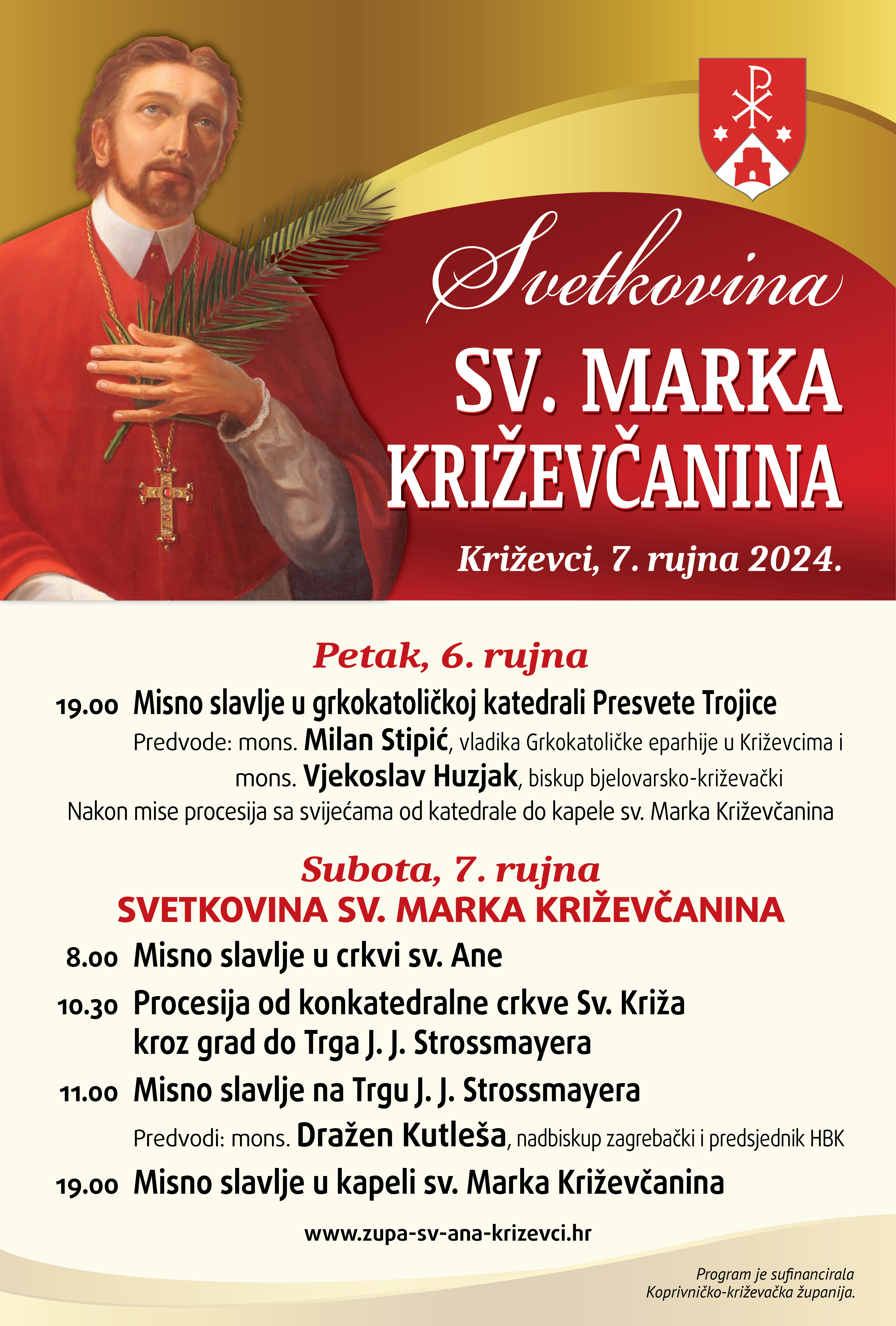 Svetkovina sv. Marka Križevčanina svečano će biti proslavljena u svečevu rodnom gradu Križevcima u subotu 7. rujna 2024. Euharistiju će predvoditi zagrebački nadbiskup mons. Dražen Kutleša, predsjednik Hrvatske biskupske konferencije.