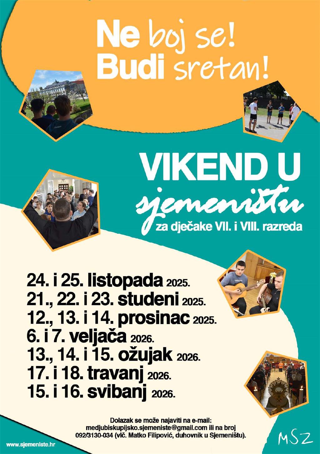 Dolazak se može najaviti na e-mail: medjubiskupijsko.sjemeniste@gmail.com ili na broj 092/3130-034 (vlč. Matko Filipović, duhovnik u Sjemeništu).