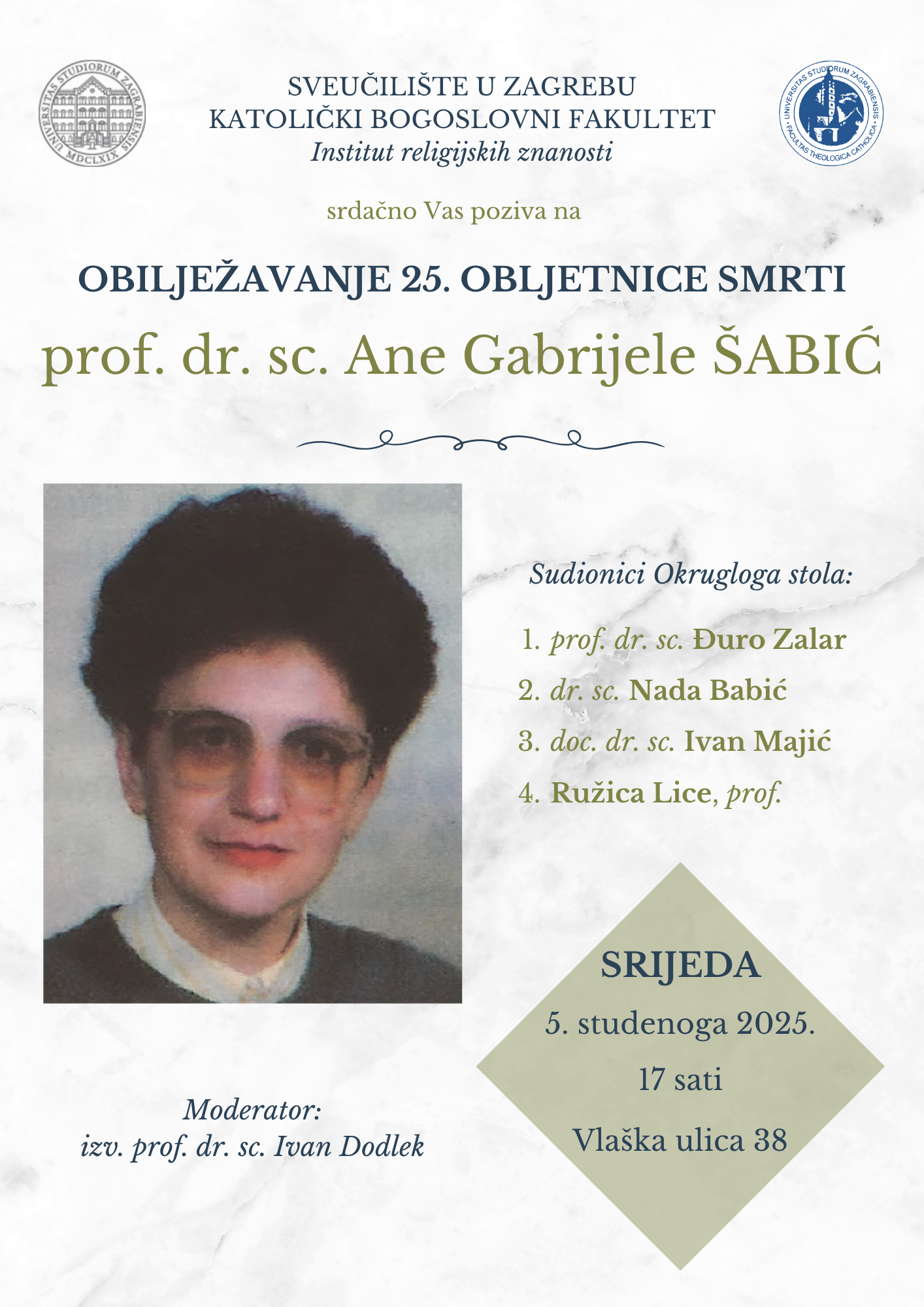 Ove godine navršava se dvadeset i peta obljetnica smrti prof. dr. sc. Ane Gabrijele Šabić (Tavankut, 6. rujna 1950. - Zagreb, 12. kolovoza 2000.), dugogodišnje profesorice na Katehetskom institutu Katoličkoga bogoslovnog fakulteta Sveučilišta u Zagrebu.