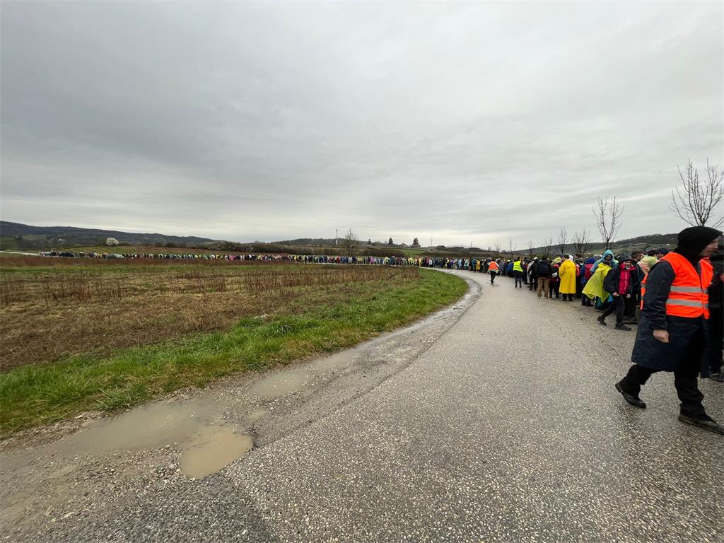 Nakon doručka, kojeg su pripremile marljive ruke organizatora i tehničkih uputa, izmoljena je prva postaja te se krenulo na put dugačak oko 20 km. Nepregledna kolona sudionika, praćena oblacima i kišom, prošla je zatim kroz Donje Orešje, Belavine, Kalinje, Vrtače, popela se na Zelinsku goru do ruševina staroga grada Zelingrada te kod planinarskog doma ”Kladešćica” napravila pauzu za ručak.