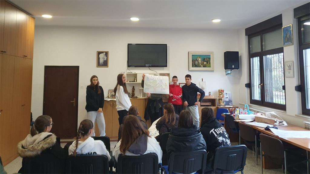 Nakon pogledanog filma o krizmi koji su prilagodili i preveli mladi iz župe te prigodne kateheze o sedam darova Duha Svetoga, krizmanici su bili podijeljeni u sedam skupina. U svakoj grupi imali su jedan dar Duha Svetoga kojeg su trebali pogoditi putem slike. Taj dar su trebali objasniti primjerom iz svakodnevnog života te su čitanjem odlomaka iz Biblije i odgovaranjem na različita pitanja animatora promišljali što zapravo znači pojedini dar Duha Svetoga to jest kako im on može pomoći u životu, posebno izgrađujući njihovu vjeru. Na kraju radionice mladi su nacrtali drvo na koje su zalijepili voće i na njih su pisali što njima zapravo znači pojedini dar Duha Svetoga i kako ga oni mogu koristiti kako bi što bolje mogli zapravo živjeti i odrastati u vjeri. Svoje radove su zatim predstavljali svim okupljenim mladima te su nakon objeda završili prvi dio tog susreta.