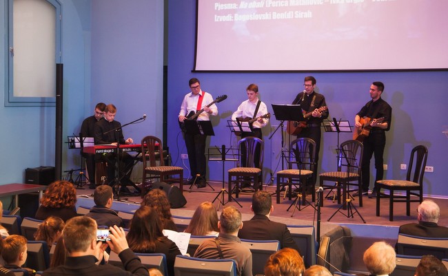 Uslijedila je predstava: Povijest roda moga hrvatskoga (na naš način) koja je na komičan način prikazala sve radosti i tjeskobe hrvatskoga naroda kroz povijest. Nakon predstave došli smo do središnjeg trenutka cijeloga susreta – misnoga slavlja u zagrebačkoj Prvostolnici kojeg je predslavio Rektor. Preč. Košćak svoju je homiliju započeo tumačenjem prvoga čitanja iz Djela apostolskih iz kojeg je vidljivo da je Crkva uživala mir Uskrsloga Krista; sve što se događa u Crkvi događa se po i s Kristom. Ona je bila potpuno usmjerena na ono što Gospodin traži. Rasla je pomoću Duha Svetoga koji je Životvorac i Tješitelj, koji daje Crkvi utjehu koja joj treba. Duh je osnaživao i oblikovao živu zajednicu Kristovih nasljedovatelja. No, otkud je proizašla Crkva koja je uživala radost i mir? Iz Isusove tvrde besjede; ona nam progovara tko je Isus Krist. U toj besjedi krije se zašto je Krist došao – da jedemo Njegovo Tijelo i pijemo Njegovu Krv. Želimo blagovati Krista, svakotjedno, svakodnevno te tako ova besjeda postaje živa, daje živo tkivo našemu životu. Darovi koje prinosimo plod su naše zemlje koju je Gospodin stvarao; On zemlji, prahu pri stvaranju daje Duh da taj prah bude živ, da ima perspektivu vječnosti, perspektivu života s Gospodinom. Zato smo se i mi ovdje okupili – oko živoga Krista – da budemo s Njim, da blagujemo Njegovo Tijelo i Krv, ono što treba trajno živjeti u nama, da sve više postajemo kristoliki.