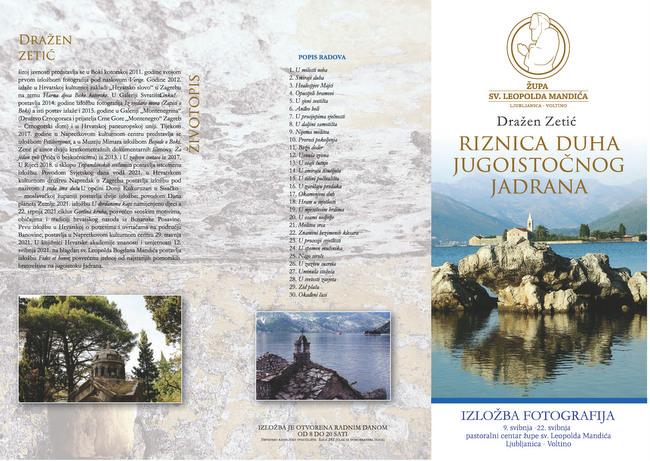 U okviru bliže duhovne pripreme i proslave blagdana sv. Leopolda Mandića, izložba » Riznica duha jugoistočnog Jadrana«, autora Dražena Zetića bit će prigodno otvorena u ponedjeljak, 9. svibnja u 19.30 sati u Pastoralnom centru Župe sv. Leopolda Mandića, Ljubljanica - Voltino.