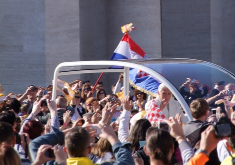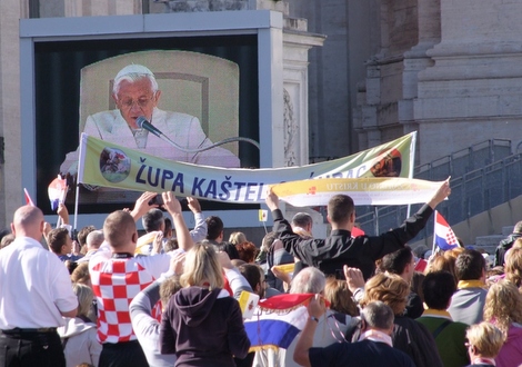 "S posebnom radošću pozdravljam vas, hodočasnike iz Hrvatske, koji ste došli, predvođeni vašim pastirima, zahvaliti za moj apostolski pohod vašoj domovini prošle godine. Naš je susret u Zagrebu bio u znaku obitelji; vaš dolazak u Rim je u Godini vjere, netom po svršetku Biskupske sinode o novoj evangelizaciji. Obitelj, vjera i evangelizacija nerazdvojno idu zajedno. To sam vam i rekao na svetoj misi prigodom Nacionalnog susreta hrvatskih katoličkih obitelji: 'Kršćanske su obitelji temelj za odgoj u vjeri, za izgradnju Crkve kao zajednice i za njezinu misionarsku nazočnost u najrazličitijim životnim situacijama'. Dragi prijatelji, pozivam vas da molite u obitelji i za obitelj. Kada sutra budete u ovoj bazilici slavili euharistiju te na grobu apostola Petra ispovjedili svoju vjeru, sjetite se svih onih koji su vam ju predali. Isto tako znajte i vi s hrabrošću svima posvjedočiti radost i ljepotu vjere u Isusa Krista. Od srca blagoslivljam sve vas i vaše najmilije. Hvaljen Isus i Marija!", rekao je Sveti Otac hrvatskim hodočasnicima na općoj audijenciji. Nakon što je zajednički otpjevan „Očenaš“ na latinskom jeziku te je Sveti Otac podijelio apostolski blagoslov, hrvatski su se nad/biskupi, predvođeni zagrebačkim nadbiskupom kardinalom Josipom Bozanićem, rukovali s papom Benediktom.