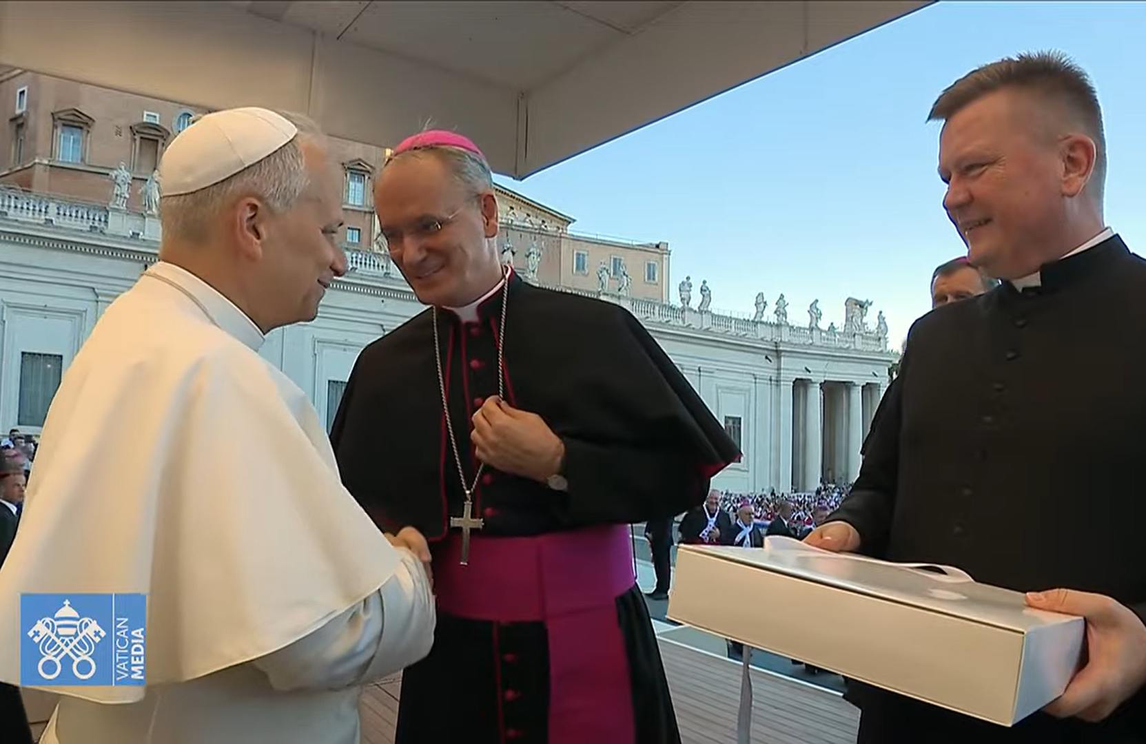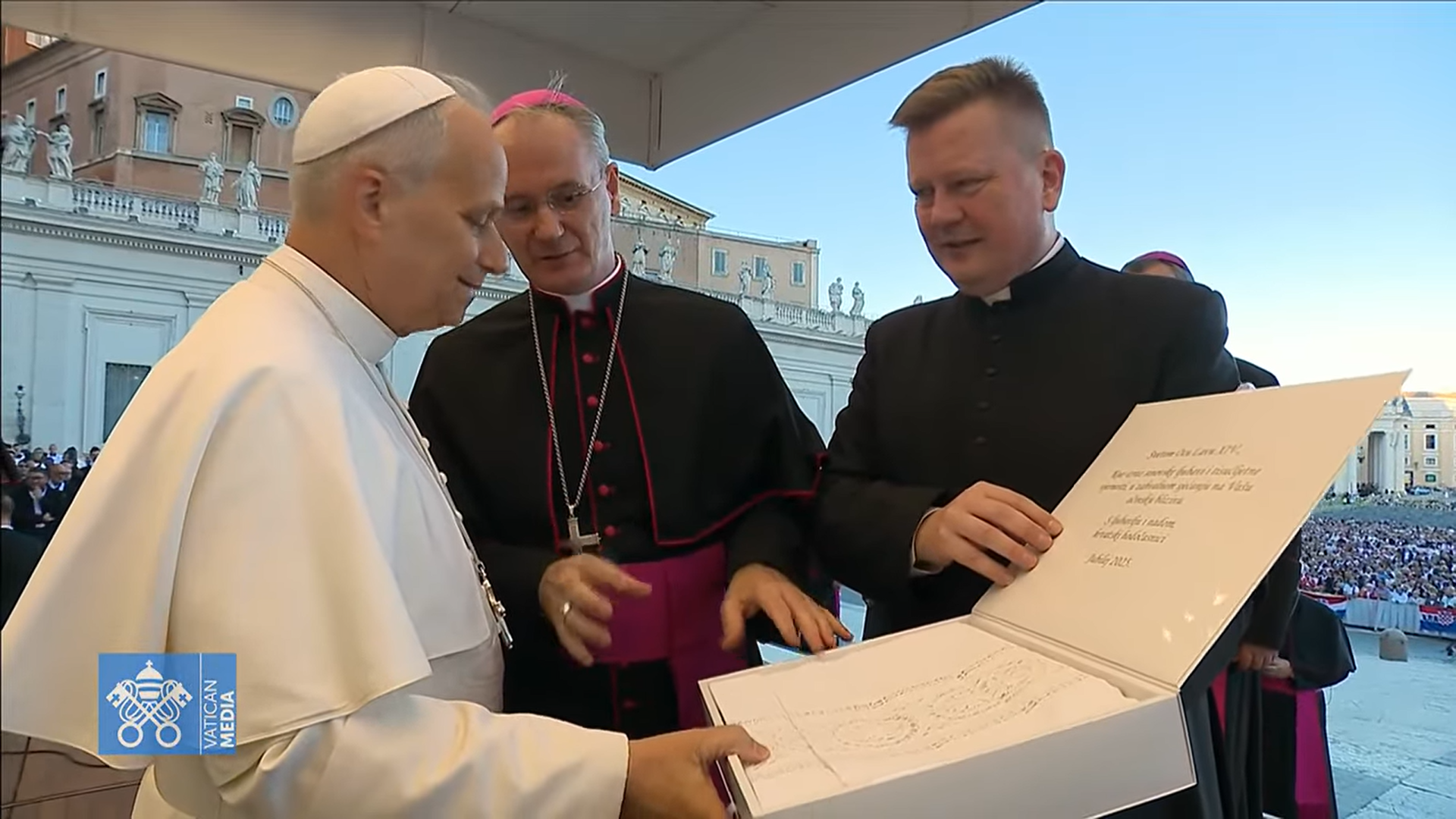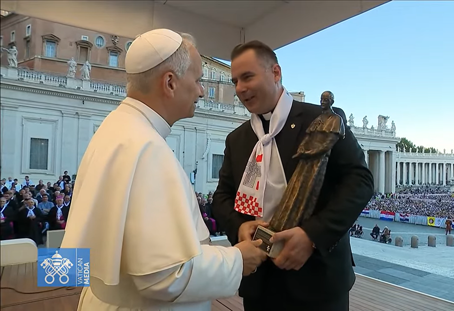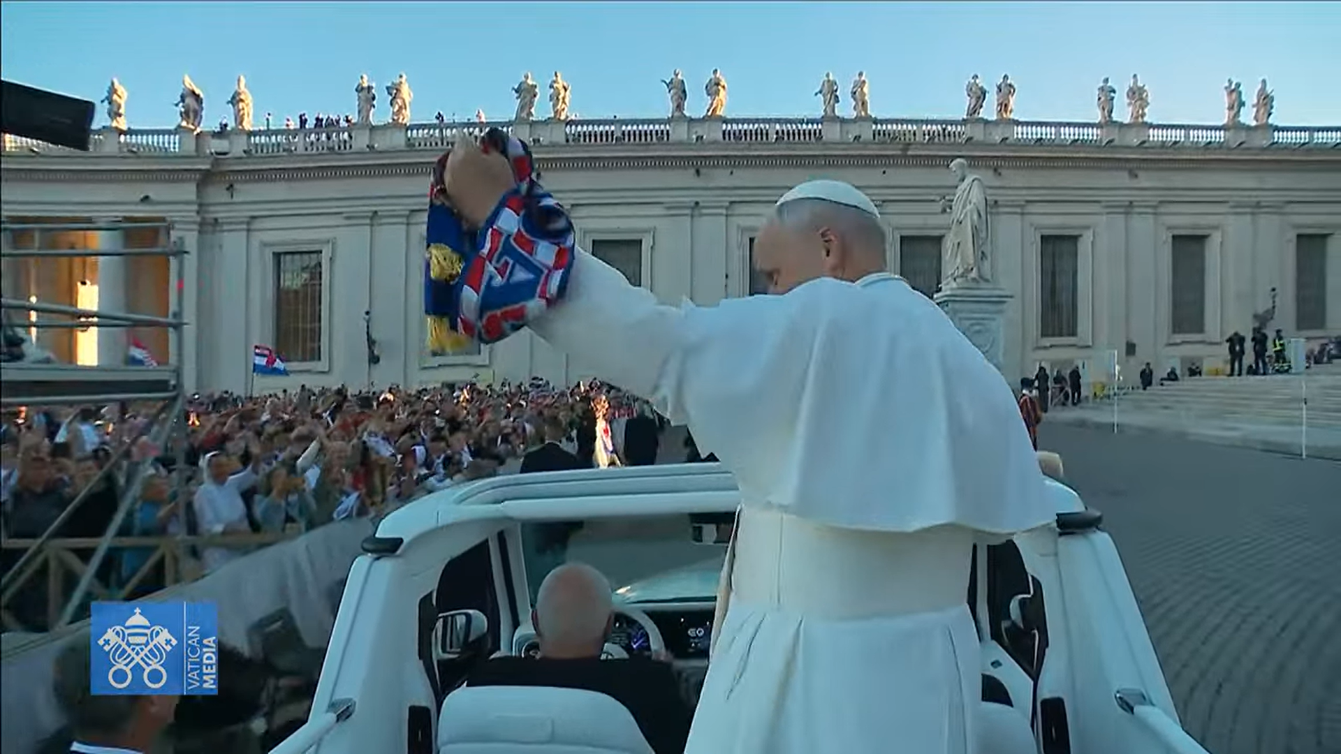 Dragi hrvatski hodočasnici, s velikom radošću želim vam dobrodošlicu na Trg sv. Petra, kamo ste pristigli povodom nacionalnog hodočašća u Jubilejskoj godini. Vaša brojna i molitvena prisutnost znak je žive vjere vašega naroda, koji je kroz stoljeća ostao čvrst u zajedništvu s Crkvom i vjeran Nasljedniku apostola Petra.