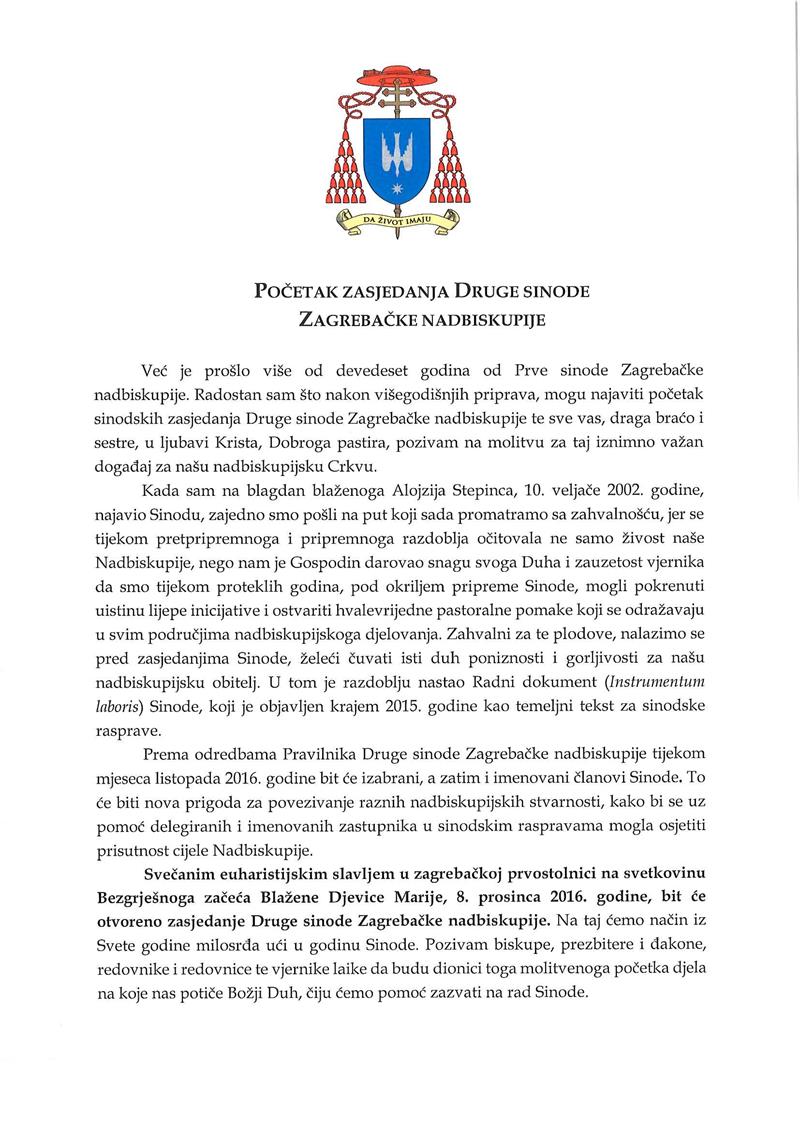 Svečanim euharistijskim slavljem u zagrebačkoj prvostolnici na svetkovinu Bezgrješnoga začeća Blažene Djevice Marije, 8. prosinca 2016. godine, bit će otvoreno zasjedanje Druge sinode Zagrebačke nadbiskupije. Na taj ćemo način iz Svete godine milosrđa ući u godinu Sinode. Pozivam biskupe, prezbitere i đakone, redovnike i redovnice te vjernike laike da budu dionici toga molitvenoga početka djela na koje nas potiče Božji Duh, čiju ćemo pomoć zazvati na rad Sinode - navodi se u pismu kardinala Bozanića.